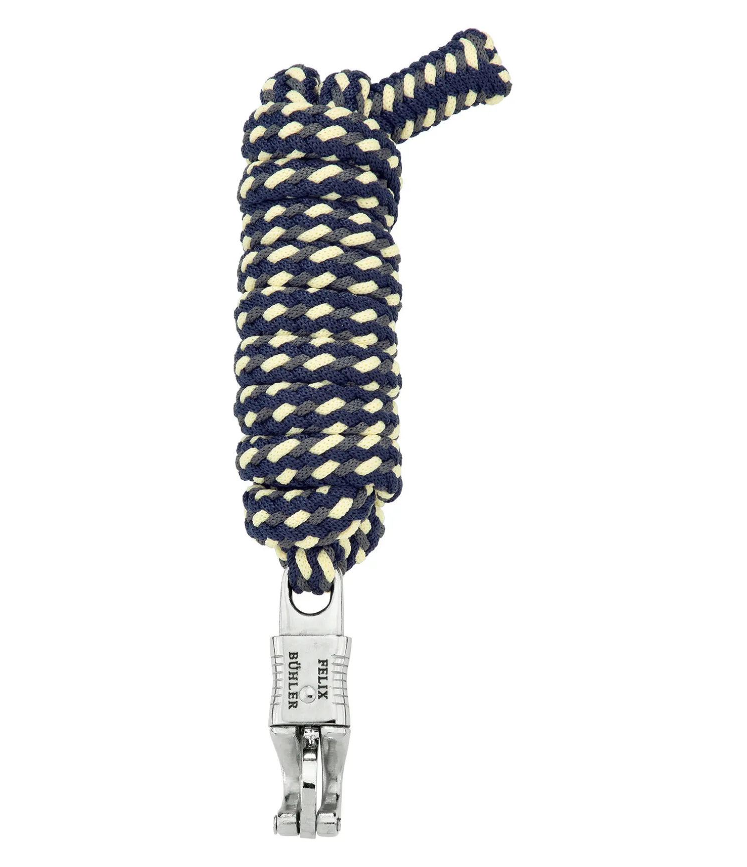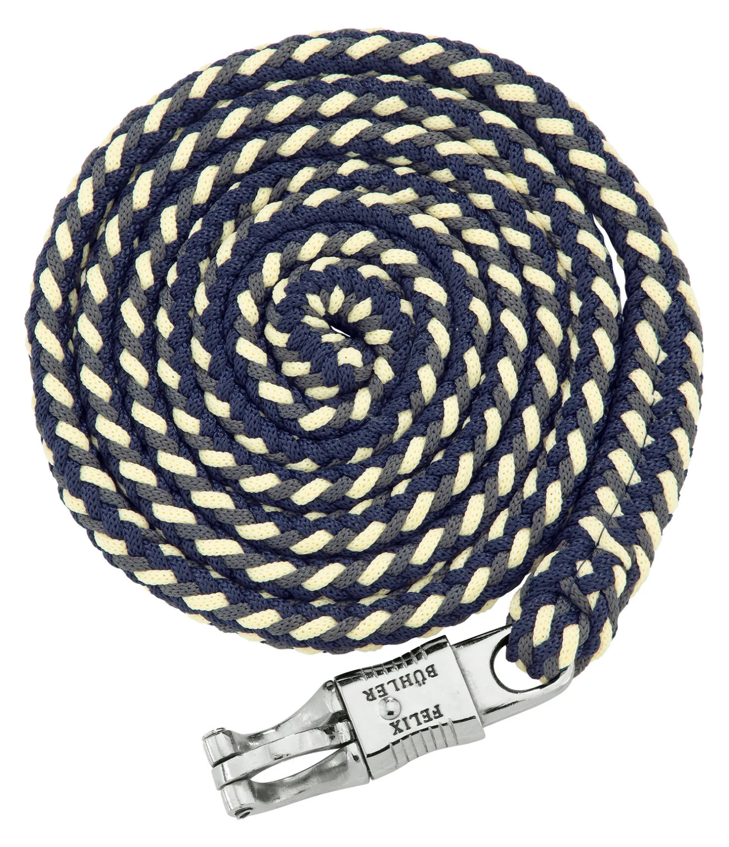 Longe tressée tricolore solide avec mousqueton anti-panique. 2 m. 100 % polyester. Assortie au licol 310056.