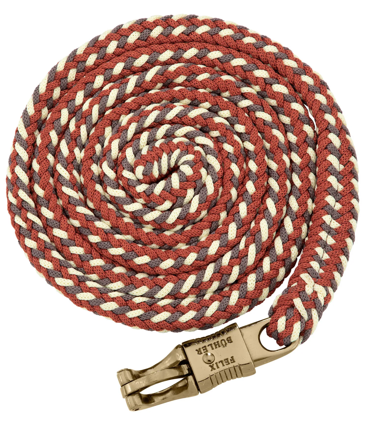 Longe tressée tricolore solide avec mousqueton anti-panique. 2 m. 100 % polyester. Assortie au licol 310056.