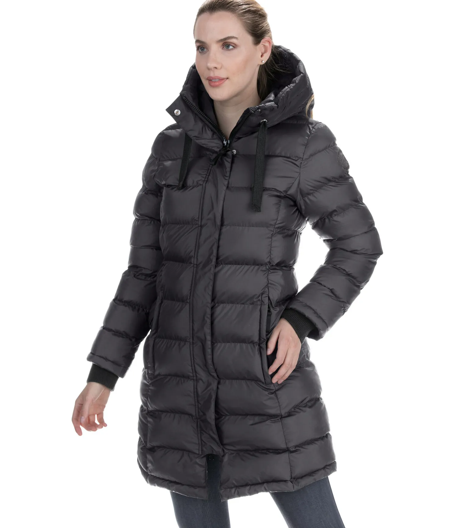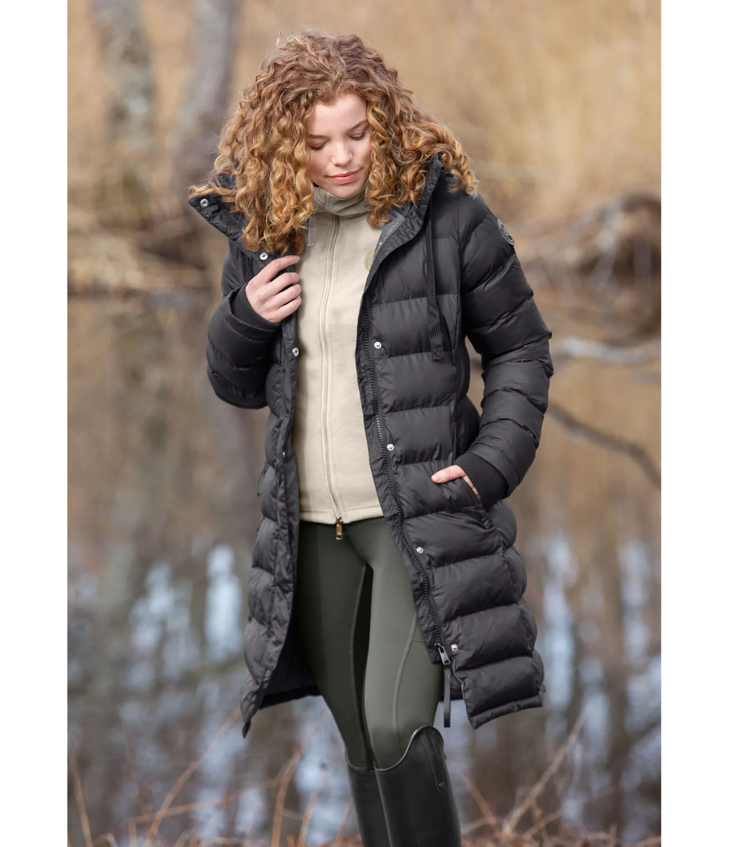 Manteau tendance long et extra chaud. Garnissage doux imitation duvet. Col montant. Capuche réglable avec système d’attache dans le dos. Fermeture à glissière double sens dissimulée. Deux poches latérales zippées dissimulées et doublées de polaire douce. Finition bord-côte en bas des manches. Longue fente cavalière zippée à l’arrière. Broderie Felix Bühler sur la manche. 100 % polyester.