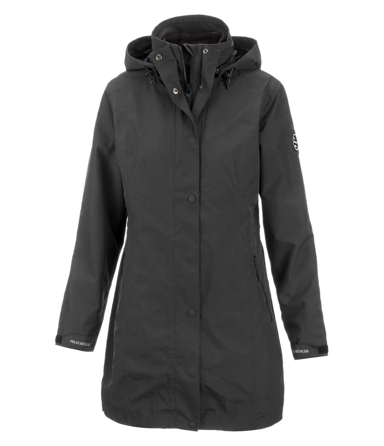 Le manteau d’équitation technique Felix Bühler offre 3 styles différents : tu peux porter chaque couche séparément ou ensemble ! Le manteau extérieur coupe-vent, imperméable (10.000 mm) et respirant possède une capuche réglable et amovible, pouvant être fixée dans le dos par bouton-pression. Fermeture à glissière double sens dissimulée avec protège-menton, 2 poches zippées imperméables, cordon de serrage à la taille, bas des manches réglables par patte auto-agrippante avec imprimé réfléchissant, 1 poche intérieure zippée, 1 longue fente cavalière avec sous-patte et fermeture à glissière à l’arrière. La doublure en polaire se fixe avec une fermeture à glissière et peut donc être portée avec ou sans le manteau extérieur. Cette doublure a un col montant, 2 poches zippées et une fente cavalière avec fermeture à glissière à l’arrière. 100 % polyester.