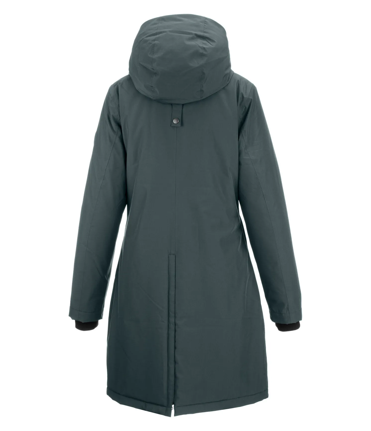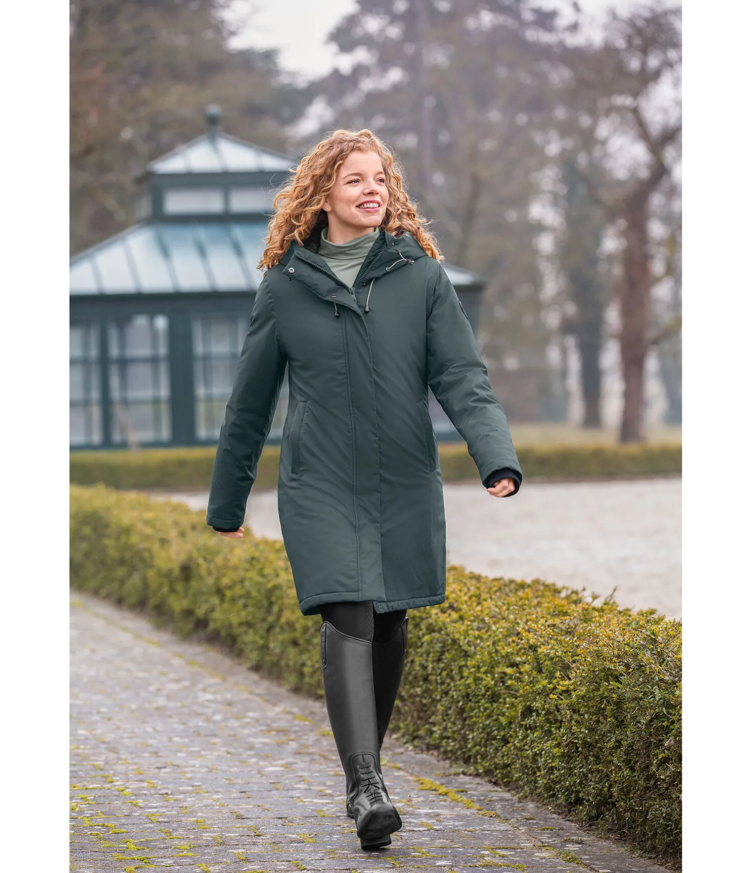 Manteau d’équitation d’hiver long. Particulièrement chaud. Col montant. Large capuche réglable, en partie repliable, avec système de fixation dans le dos. Matière imperméable (10.000 mm), coupe-vent et respirante (5.000 MVTR). Garnissage imitation duvet. Finition en bord-côte sur le bas des manches. Deux poches latérales zippées dissimulées et une poche intérieure. Fermeture à glissière double sens dissimulée avec protège-menton. Une fente cavalière zippée à l’arrière. Motifs gaufrés discrets à l’intérieur. Badge Felix Bühler sur la manche. 100 % polyester.