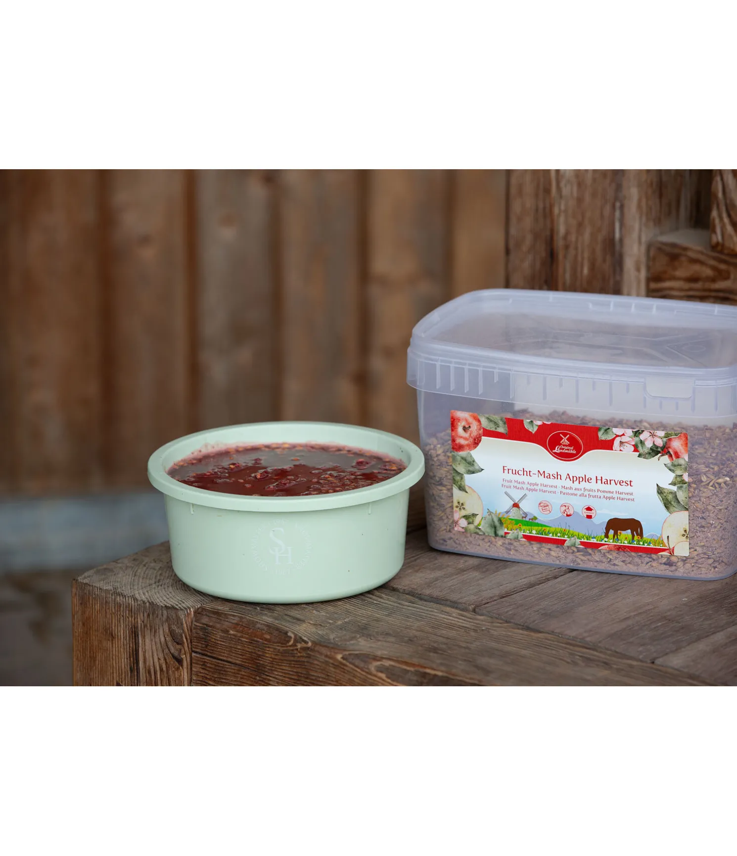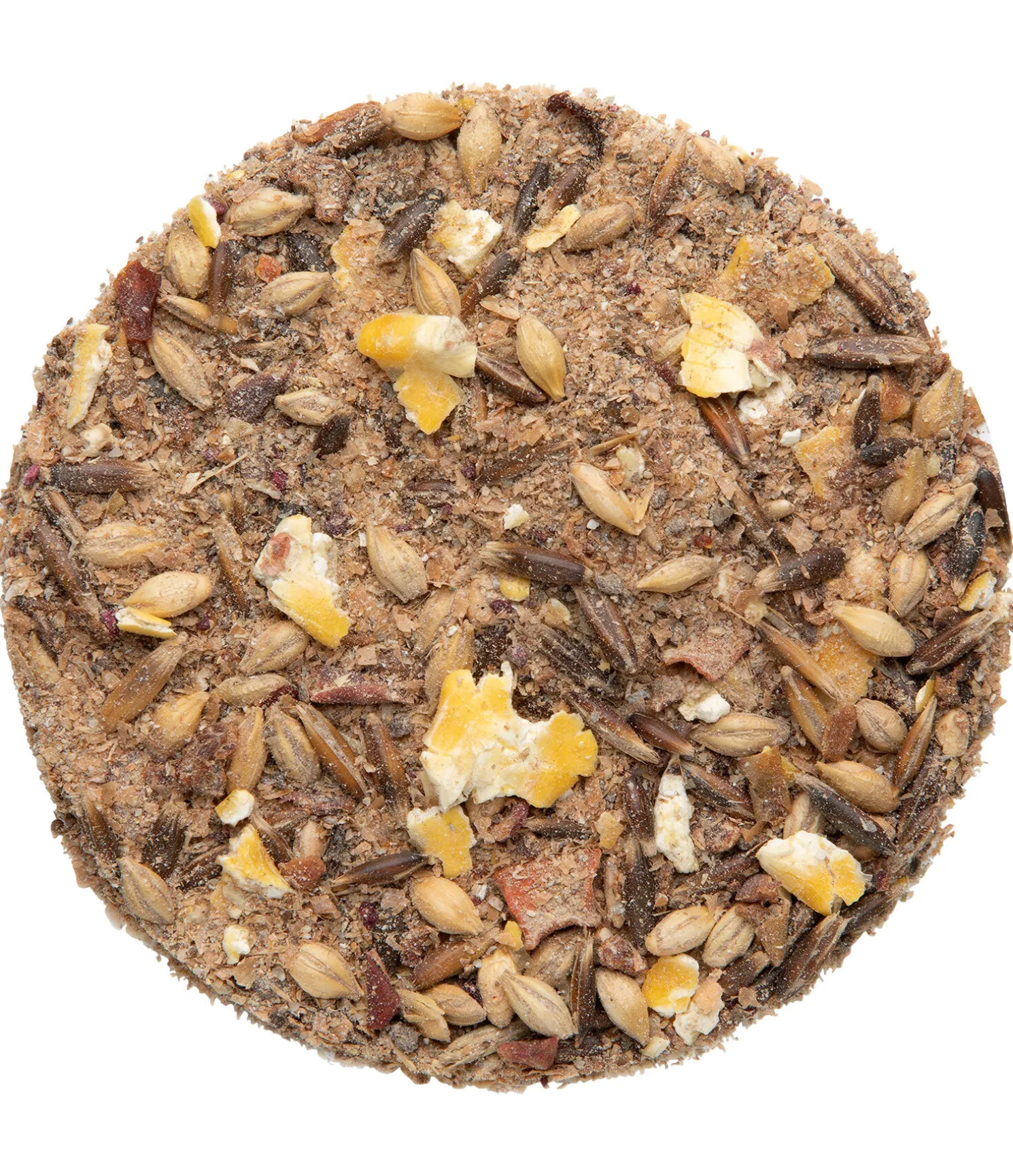 Composition : son de blé, orge (aplatie), avoine noire, grains de maïs (aplatis), tourteau de lin, 6.58 % de marc de pomme, 3 % de betterave rouge (séchée), mélasse de betterave sucrière, 2 % de mélange de fruits (25 % de dés de pommes, 25 % de dés de carottes, 20 % de chips de bananes, 15 % de dés de betteraves rouges, 15 % de cynorrhodon), levure de bière. *La recette contenant un prémix, le total fait plus de 100 %.