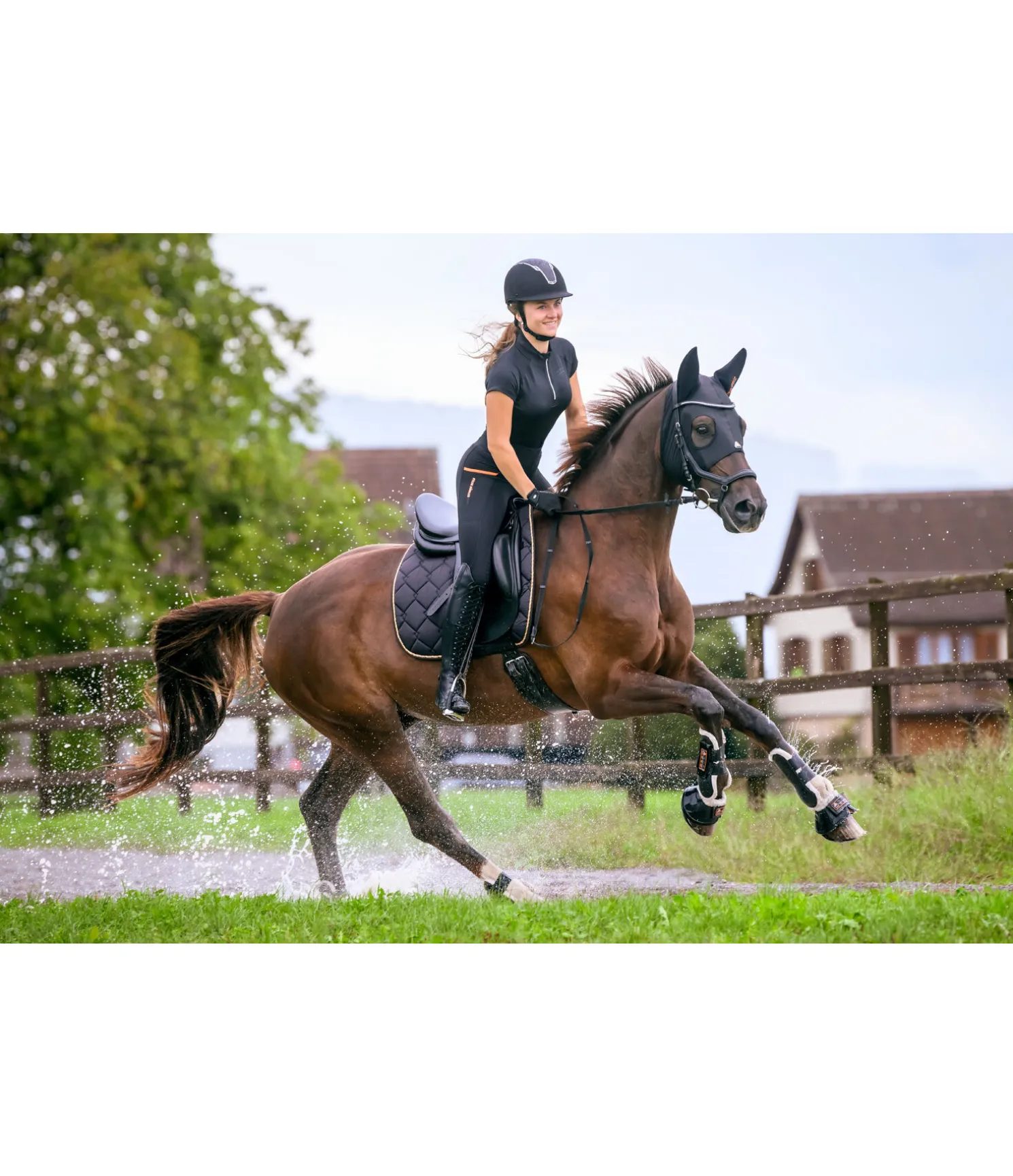 Masque élastique, moulant et particulièrement fin à enfiler sous le bridon. Facile à enfiler sur la tête, sans fermetures gênantes. Avec fibres de céramique stimulant la circulation sanguine et ainsi soulageant les tensions, ayant aussi un effet positif sur la capacité de concentration et donc sur les performances. La partie des oreilles est faite de caoutchouc chloroprène. Cela réduit le bruit de fond pour le cheval et peut ainsi avoir un effet relaxant. Nous déconseillons aux femmes enceintes ainsi qu’aux animaux en gestation l’utilisation des articles contenant des fibres de céramique. 65 % polyester, 10 % élasthanne, 25 % caoutchouc styrène-butadiène. Remarque: ce masque est autorisé pour les concours nationaux officiels et en course.