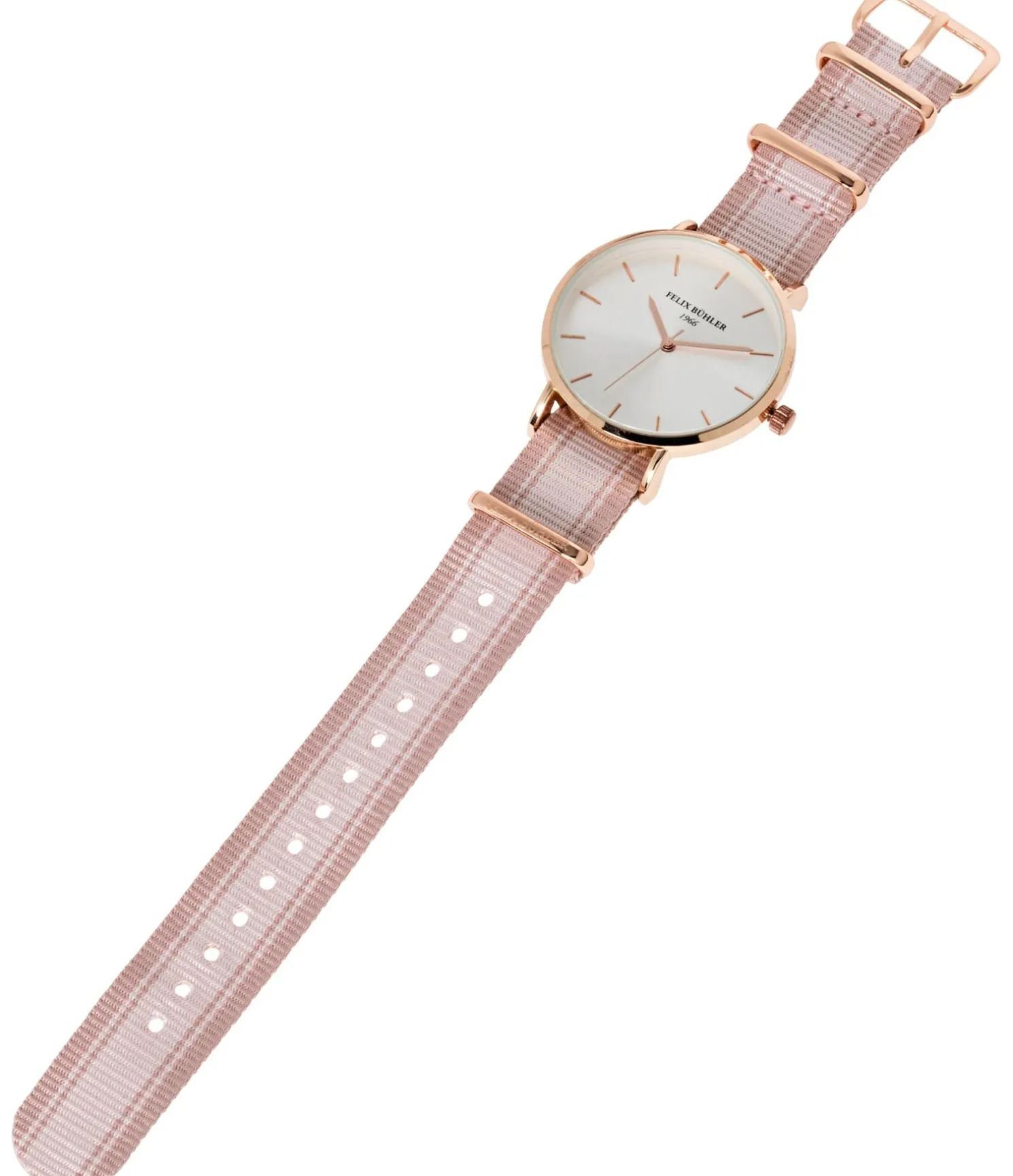 Montre avec joli cadran Felix Bühler. Sportswear. Bracelet en tissu robuste avec rayures bicolores. Cadran rose doré brillant. Mouvement Miyota 2035. Étanchéité 3 ATM signifiant que la montre résiste aux éclaboussures. Livrée dans une jolie boîte à bijoux Felix Bühler. Diamètre 35 mm. Bracelet 23,5 x 1,8 cm.