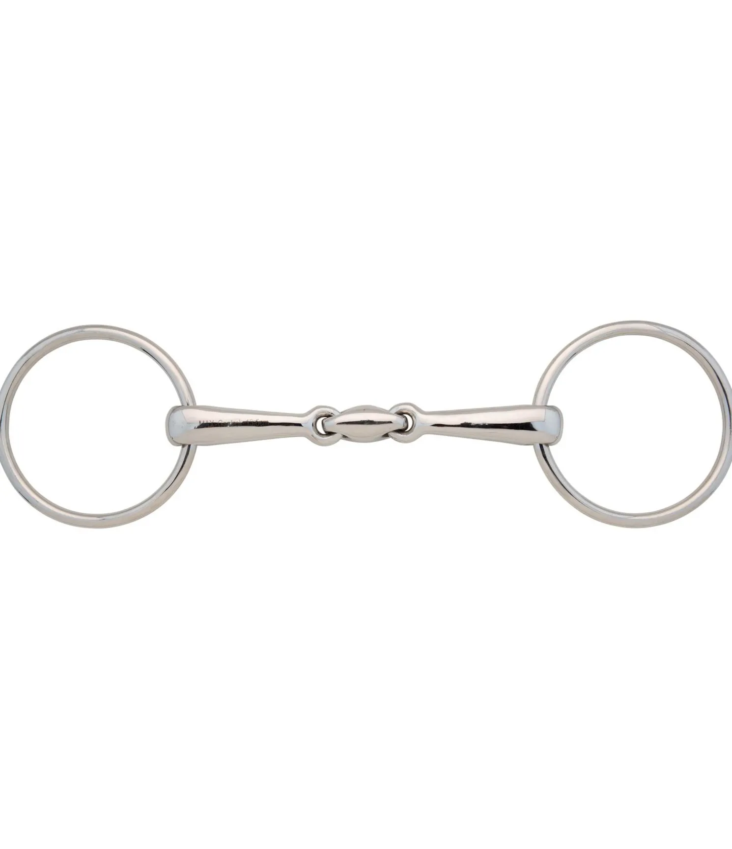 Mors double brisure pour l’apprentissage ou les corrections. Bloqué par un angle de brisure maximal, qui donne au mors une action similaire à celle d’un mors droit. Cet effet rigide se produit dès que le cheval essaie d’aller contre la main. Dès que le cheval se pose sur le mors, cet effet cesse. Épaisseur des canons 16 mm, diamètre des anneaux 70 mm.