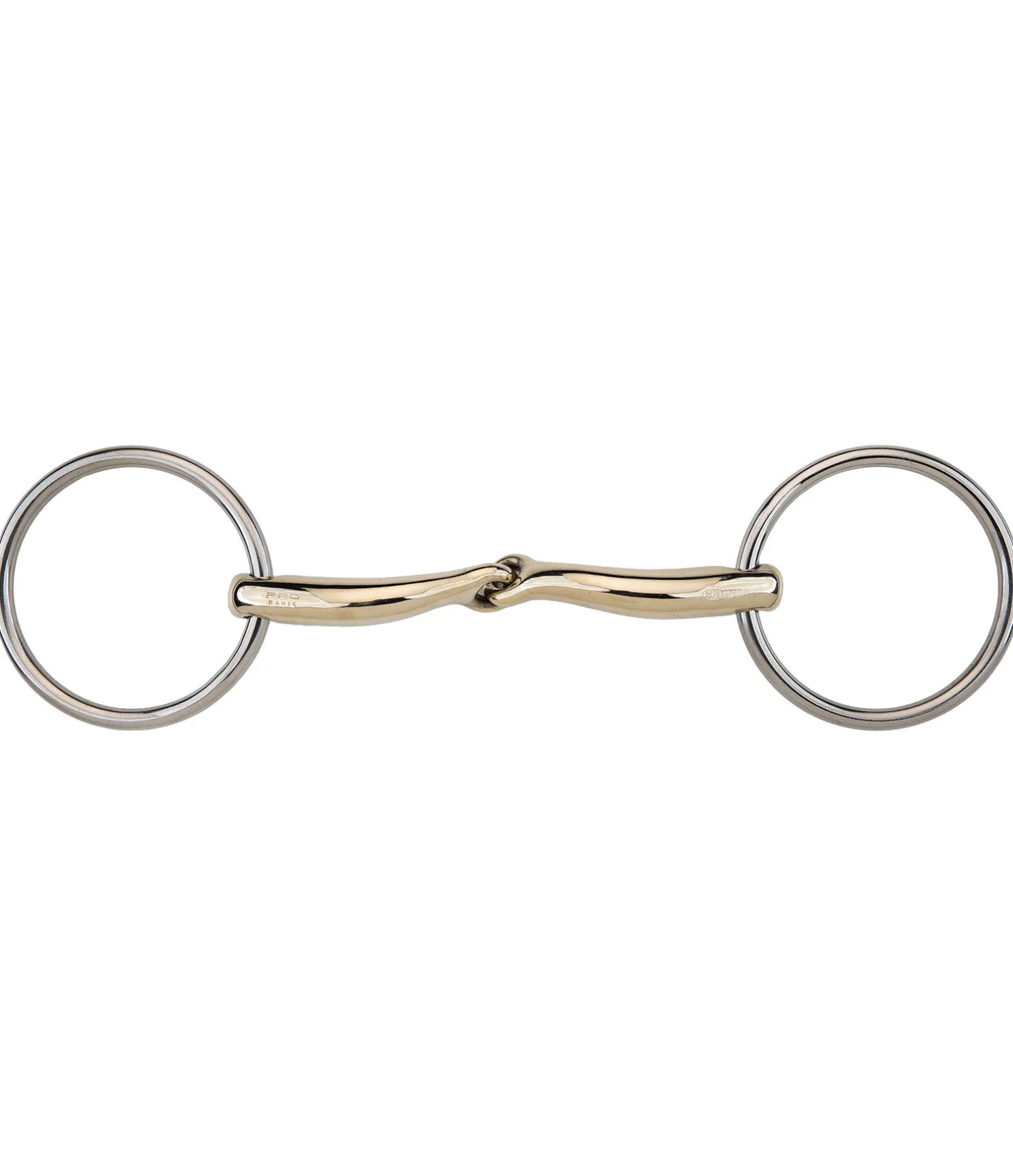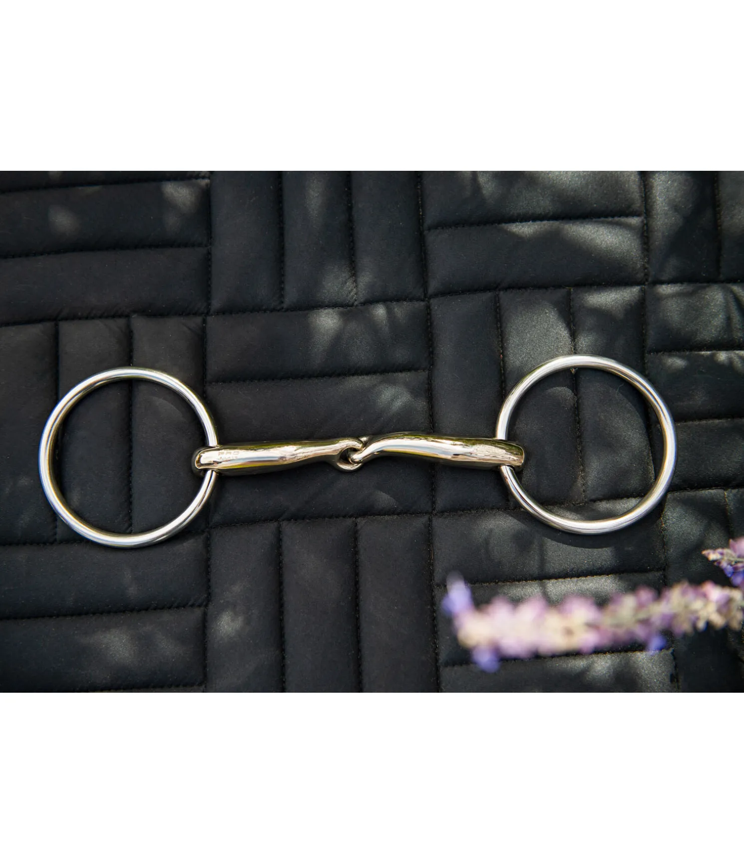Mors de filet à anneaux à simple brisure, anatomiquement et ergonomiquement adapté, avec passage de langue évasé vers l’avant. Aide le cheval à se redresser et le cavalier à prendre contact avec la bouche. Efficace, sans être trop fort pour les chevaux qui tirent à l’approche du saut ou qui ont tendance à s’appuyer sur le mors. Convient également aux chevaux sensibles. Idéal pour affiner les aides. Sensogan avec côtés en acier inoxydable. Epaisseur du mors 14 mm, taille de l’anneau 70 mm.