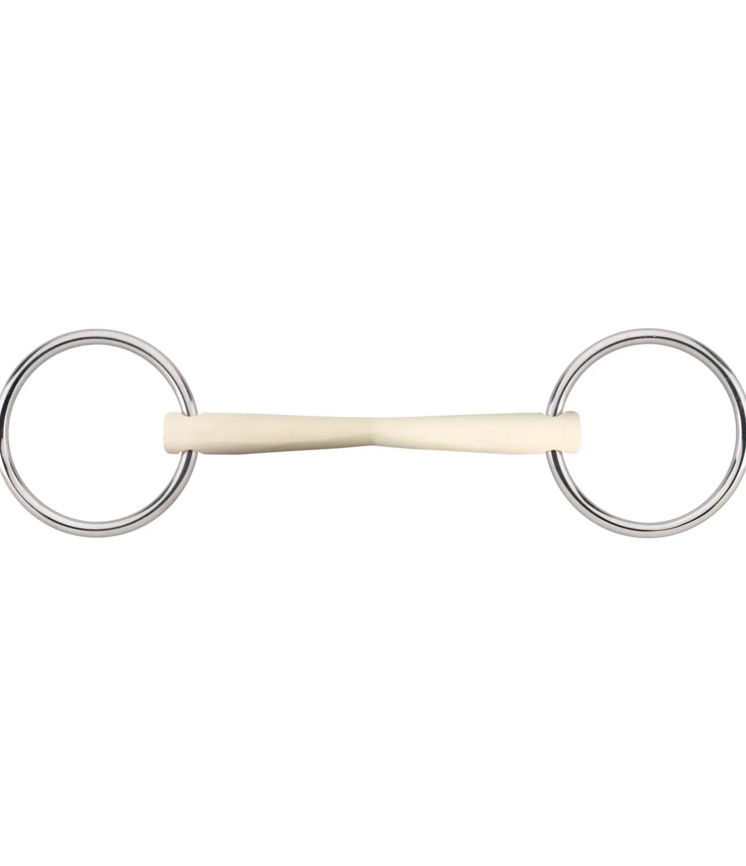 Mors droit innovant, avec canons en caoutchouc souple. Le matériau est non-toxique, sans solvants, résistant aux UV et ne contient pas d’agents assouplissants. Avec coeur en acier qui assure la sécurité. Deux formes possibles : utiliser le côté droit ou le côté légèrement incurvé au besoin. Épaisseur des canons 16 mm, taille de l’anneau 70 mm.