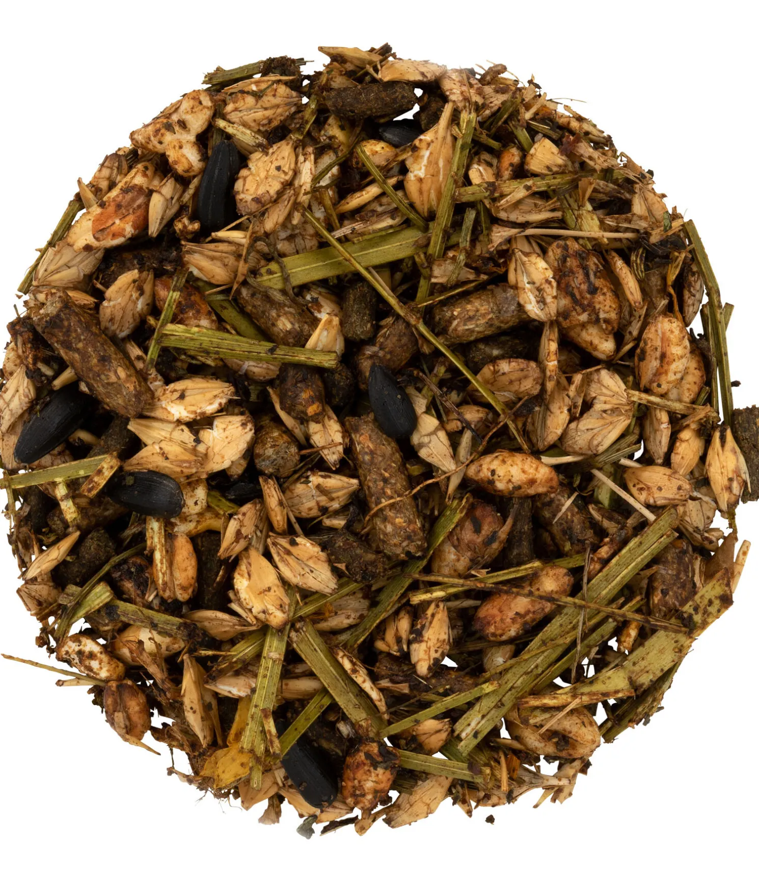 Composition : Orge (aplatie, concassée), pellets de son d’avoine, maïs (concassé), bouchons de luzerne, pulpe de betterave sucrière séchée, graines de tournesol, sirop de betterave sucrière, luzerne (séché à haute température), marc de pomme (séché), carbonate de calcium, huile de soja (sans OGM), 1 % mélange d’herbes aromatiques (persil, coriandre, menthe poivrée, ortie, romarin, basilic, ail), chlorure de sodium, bicarbonate de sodium, son de blé, oxyde de magnésium, phosphate monocalcique, drêche de bière, levure de bière.