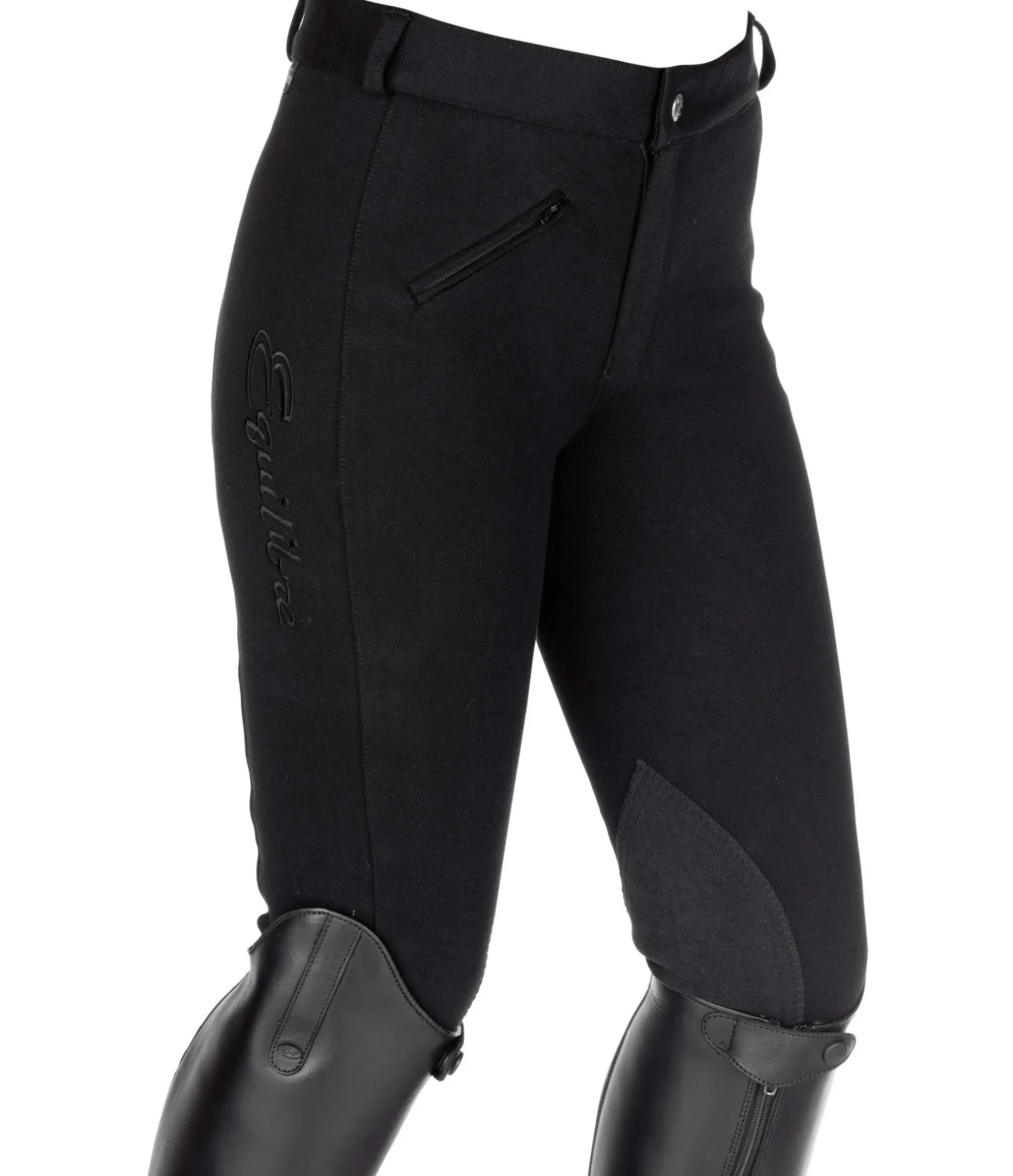 Pantalon d’équitation bicolore à basanes. Broderie de couleur contrastante sur la cuisse. 92 % coton, 8 % élasthanne.