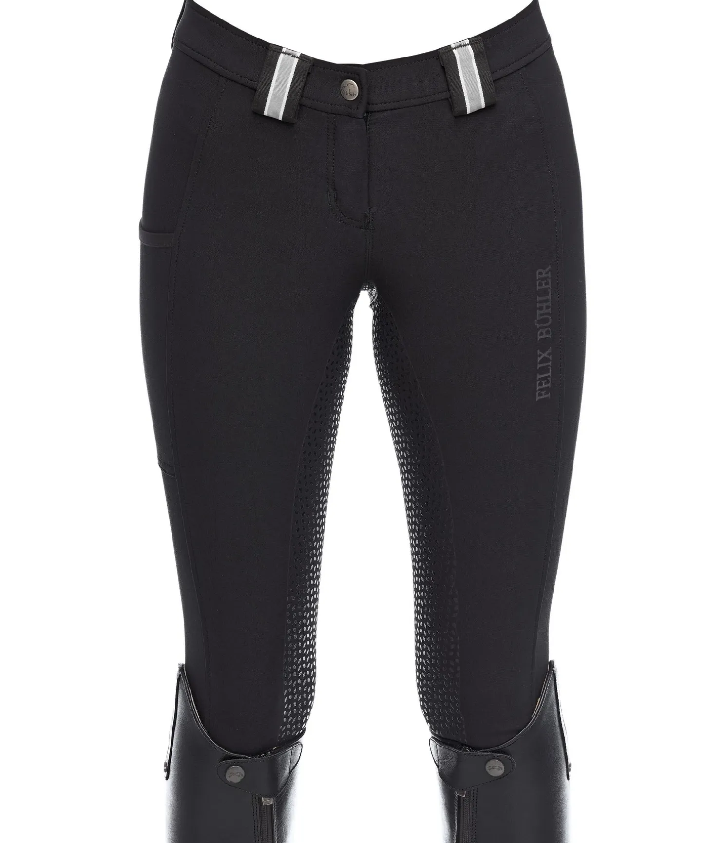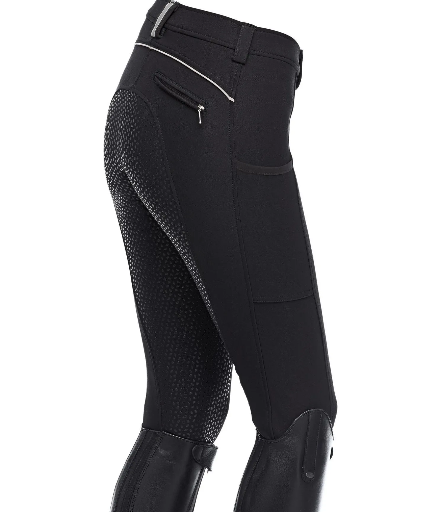 Pantalon d’équitation adapté à toutes les saisons. Fond intégral Grip siliconé pour une parfaite adhérence à la selle. Bas de jambe extensible sans patte auto-agrippante. Aucune couture au niveau des genoux. Matière extensible, déperlante et respirante. Résistant à la déchirure et facile d’entretien. Grande poche pour téléphone portable sur la jambe, une poche zippée discrète arrière. Ceinture élastiquée avec passants à rayures de couleur contrastante. 93 % nylon, 7 % élasthanne.