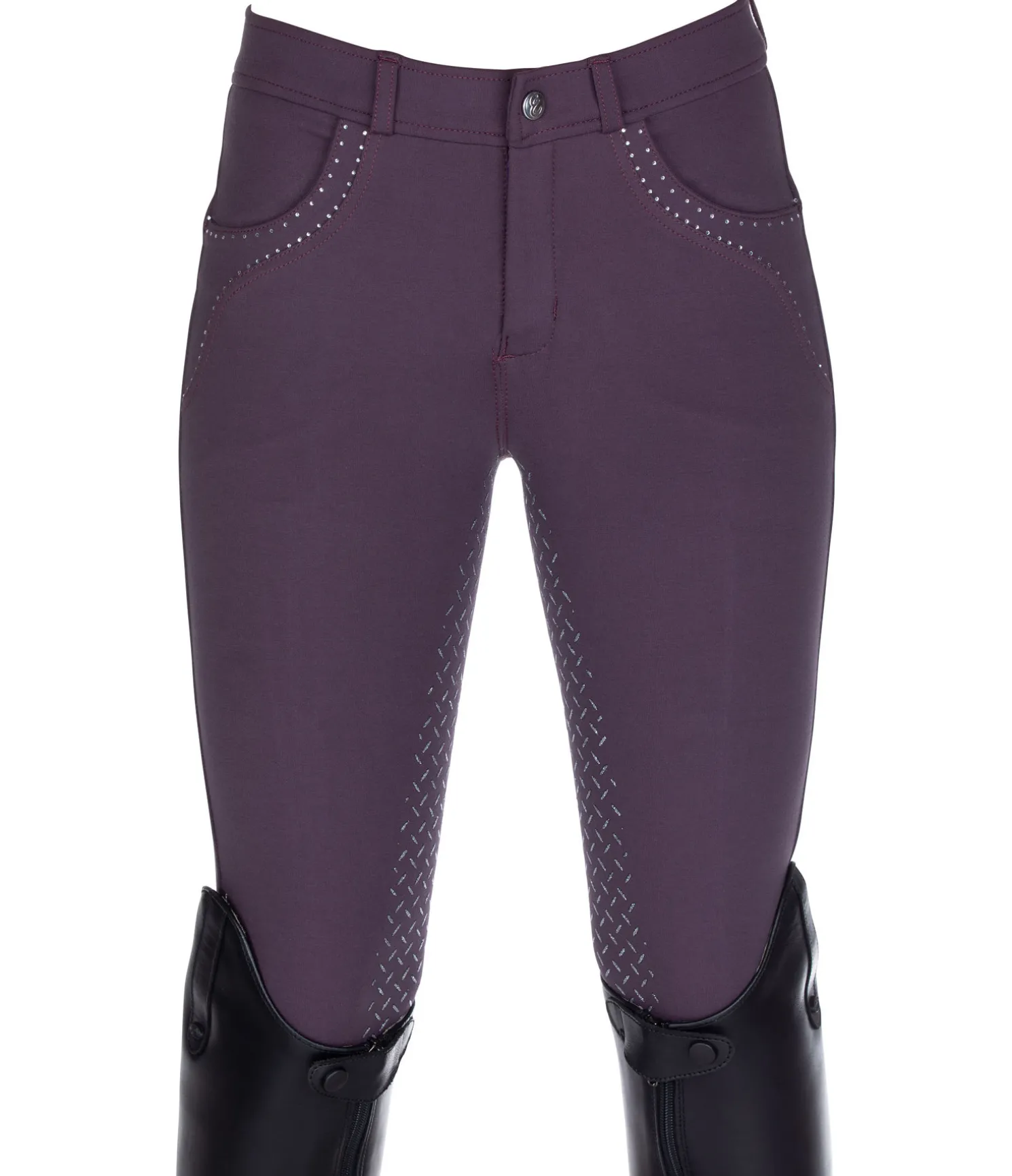 Pantalon d’équitation. Fond intégral grip en silicone scintillant. Matière stretch respirante, extensible dans 4 directions et ultra confortable. Strass sur les poches avant. Bas de jambe extensible sans patte auto-agrippante. 68 % viscose, 27 % polyamide, 5 % élasthanne.