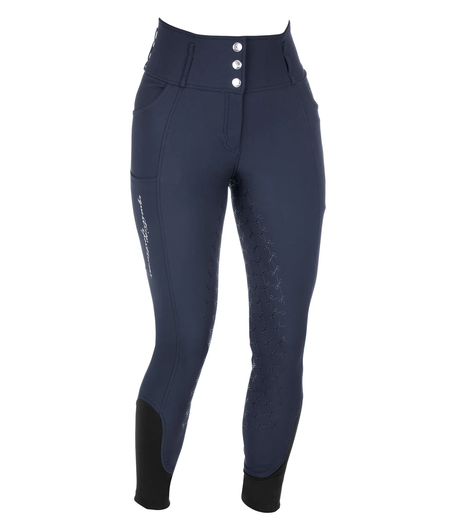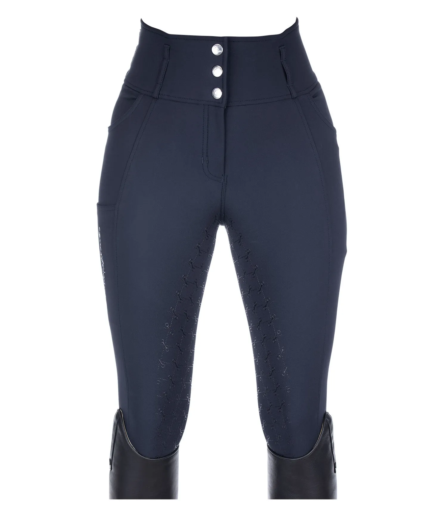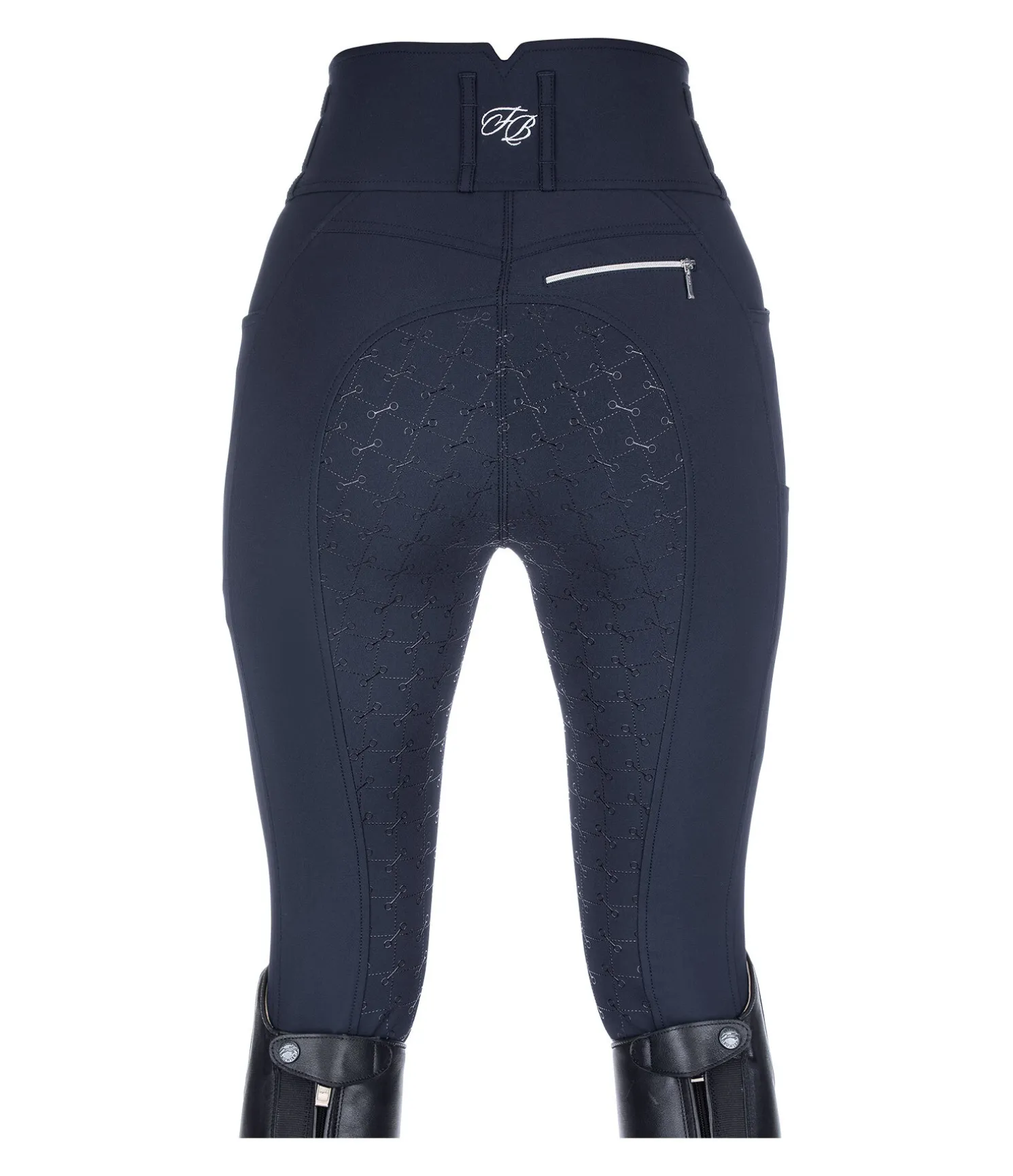 Pantalon d’équitation taille haute. Fond intégral grip avec motif de mors en silicone.Matière respirante et extensible. Séchage rapide. Ceinture large avec passants et trois boutons. Signature Felix Bühler sur la jambe. Une poche arrière zippée. Une poche pour téléphone portable sur la jambe. Deux poches latérales. Aucune couture aux genoux. Bas de jambe en stretch. Matière : 88 % polyamide, 12 % élasthanne.