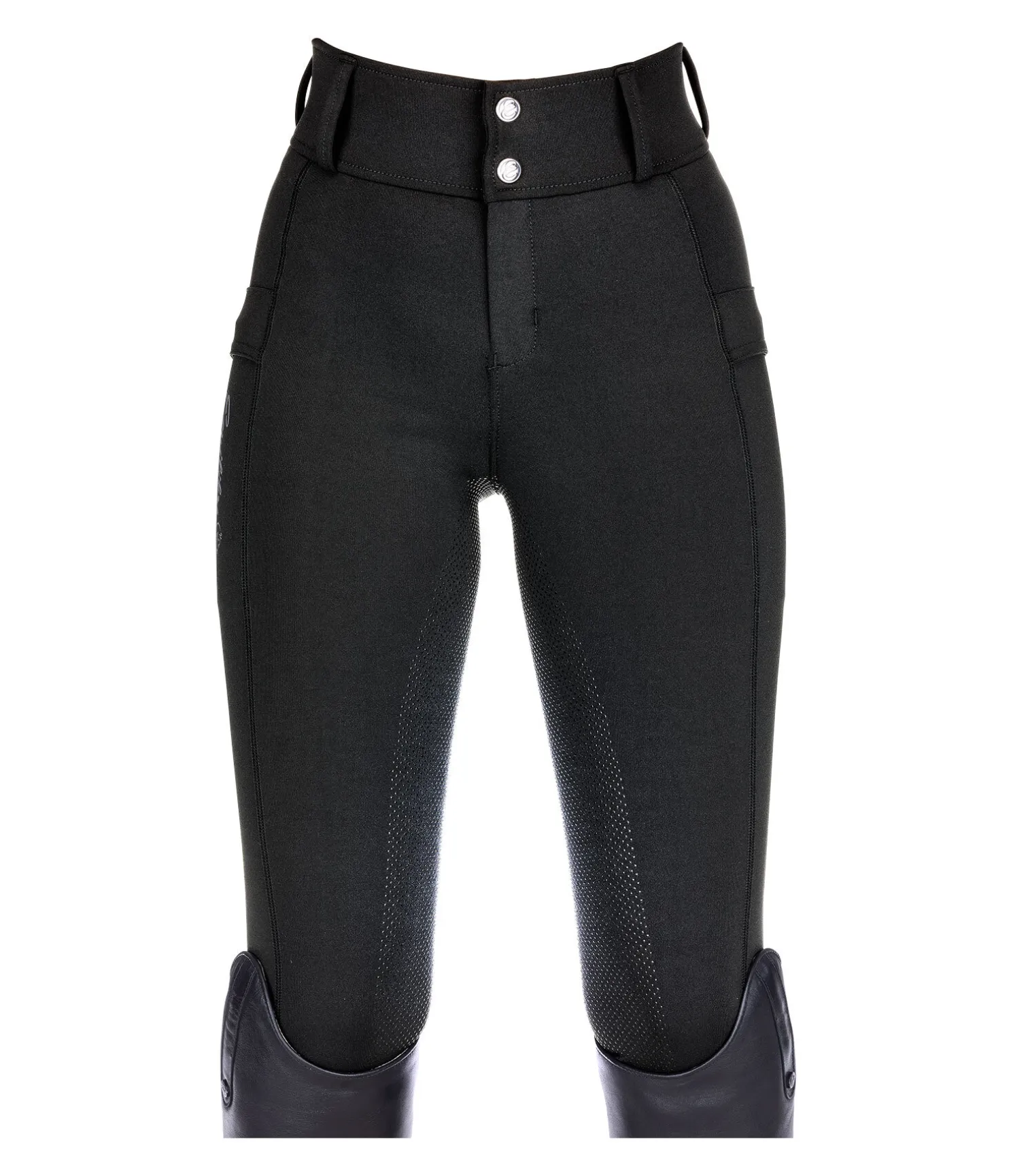 Pantalon d’équitation à fond intégral grip en silicone. Sportswear. Matière stretch respirante et extensible dans 4 directions. Poches latérales pour téléphone portable avec logo imprimé. Bas de jambe extensible. Ceinture large avec passants. Logo scintillant à l’arrière. Disponible dans des tailles intermédiaires. 89 % polyester, 11 % élasthanne.