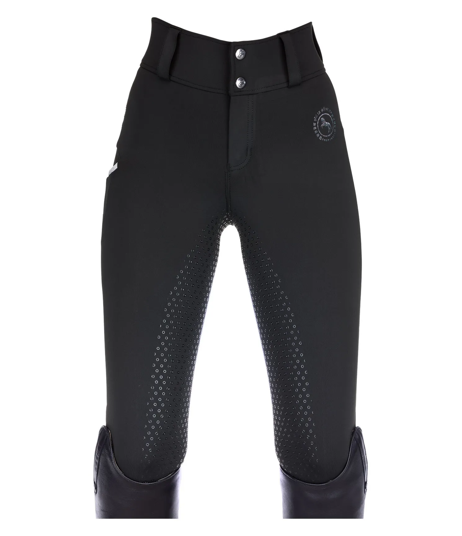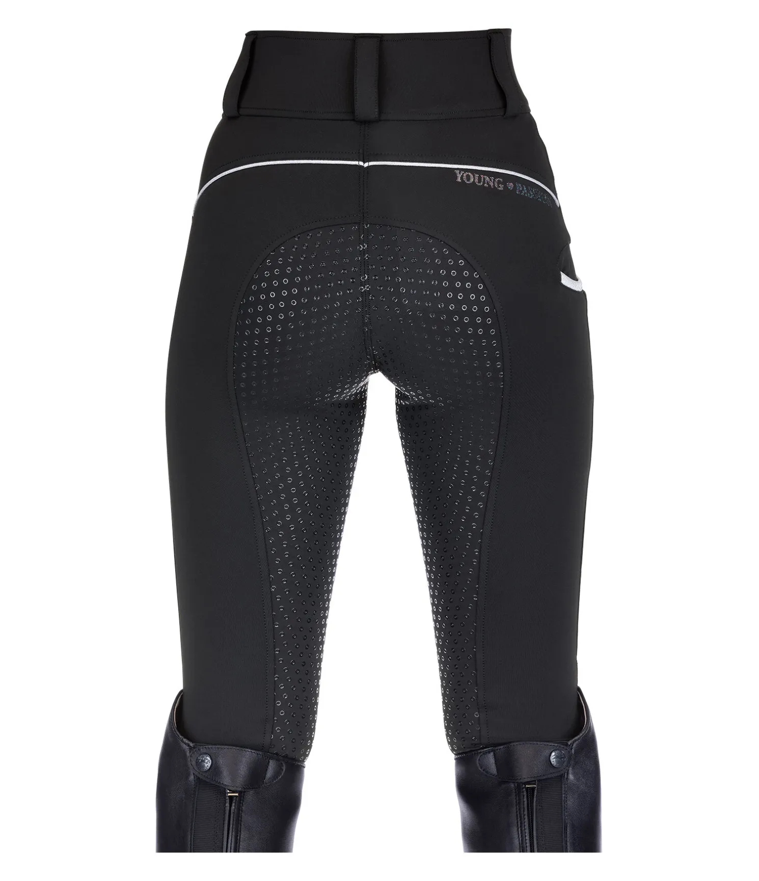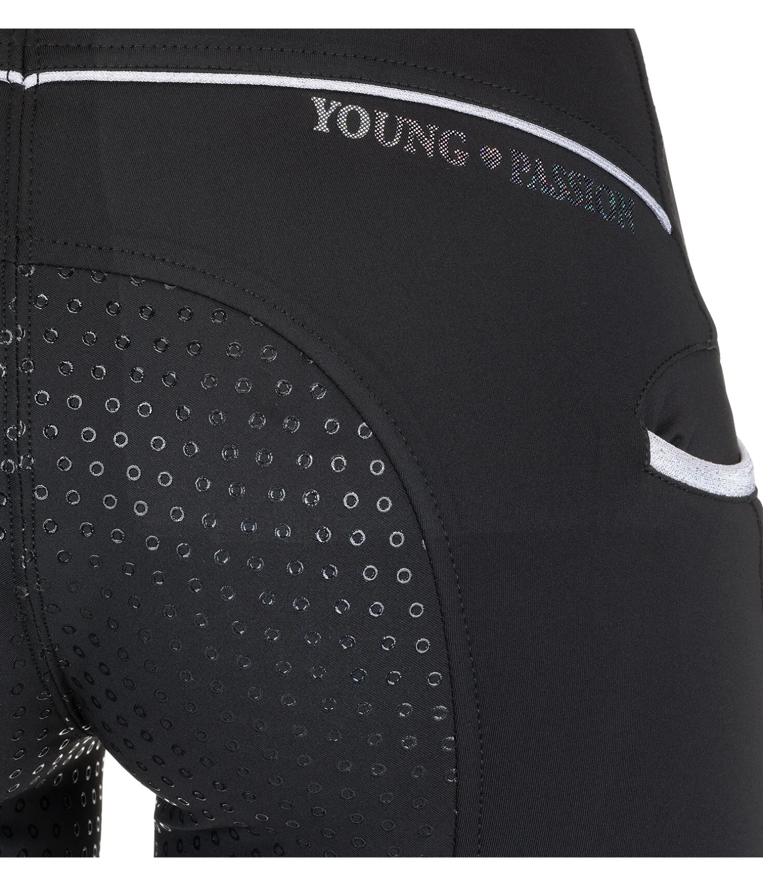 Pantalon d’équitation confortable à fond intégral grip en silicone. Matière stretch respirante, extensible dans 4 directions. Une poche latérale pour téléphone portable sur la jambe droite avec bordure scintillante. Motif cheval à l’avant. Passepoil scintillant à l’arrière avec slogan « YOUNG PASSION ». Bas de jambe extensible sans patte auto-agrippante. Aucune couture gênante aux genoux. 78 % polyester, 22 % élasthanne.