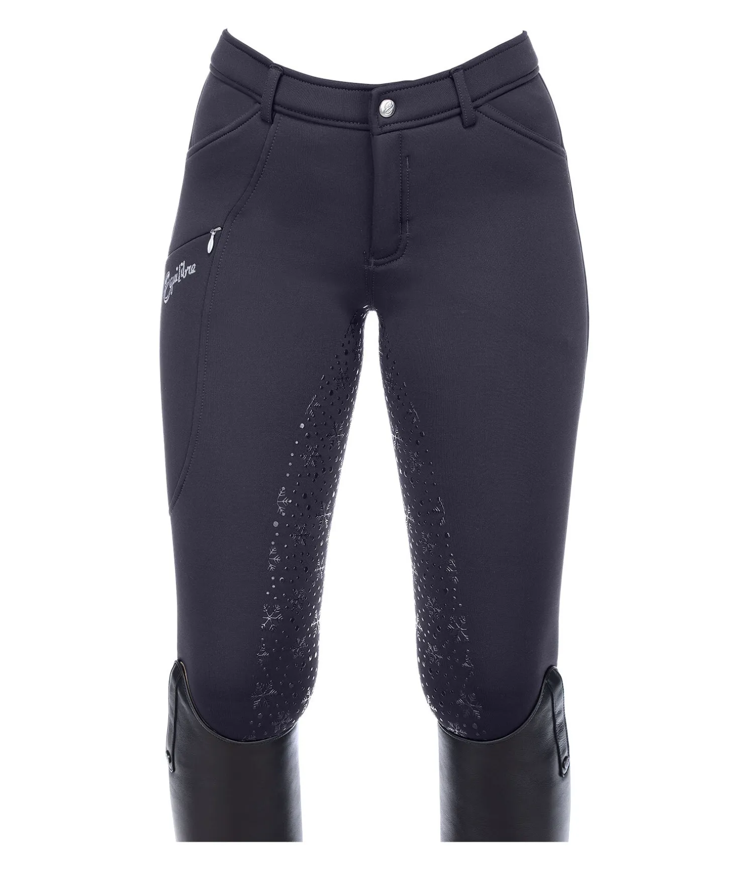 Pantalon d’équitation hiver chaud à fond intégral grip en silicone avec motif flocon de neige. Intérieur molletonné. Bas de jambe extensible. Matière stretch respirante et extensible dans 4 directions. 1 poche zippée sur la cuisse pour téléphone portable avec imprimé Equilibre, 2 poches avant et 2 poches arrière. Ceinture élastiquée avec passants. Joli flocon de neige imprimé sur la poche arrière. 60 % polyester, 33 % polyamide, 7 % élasthanne.