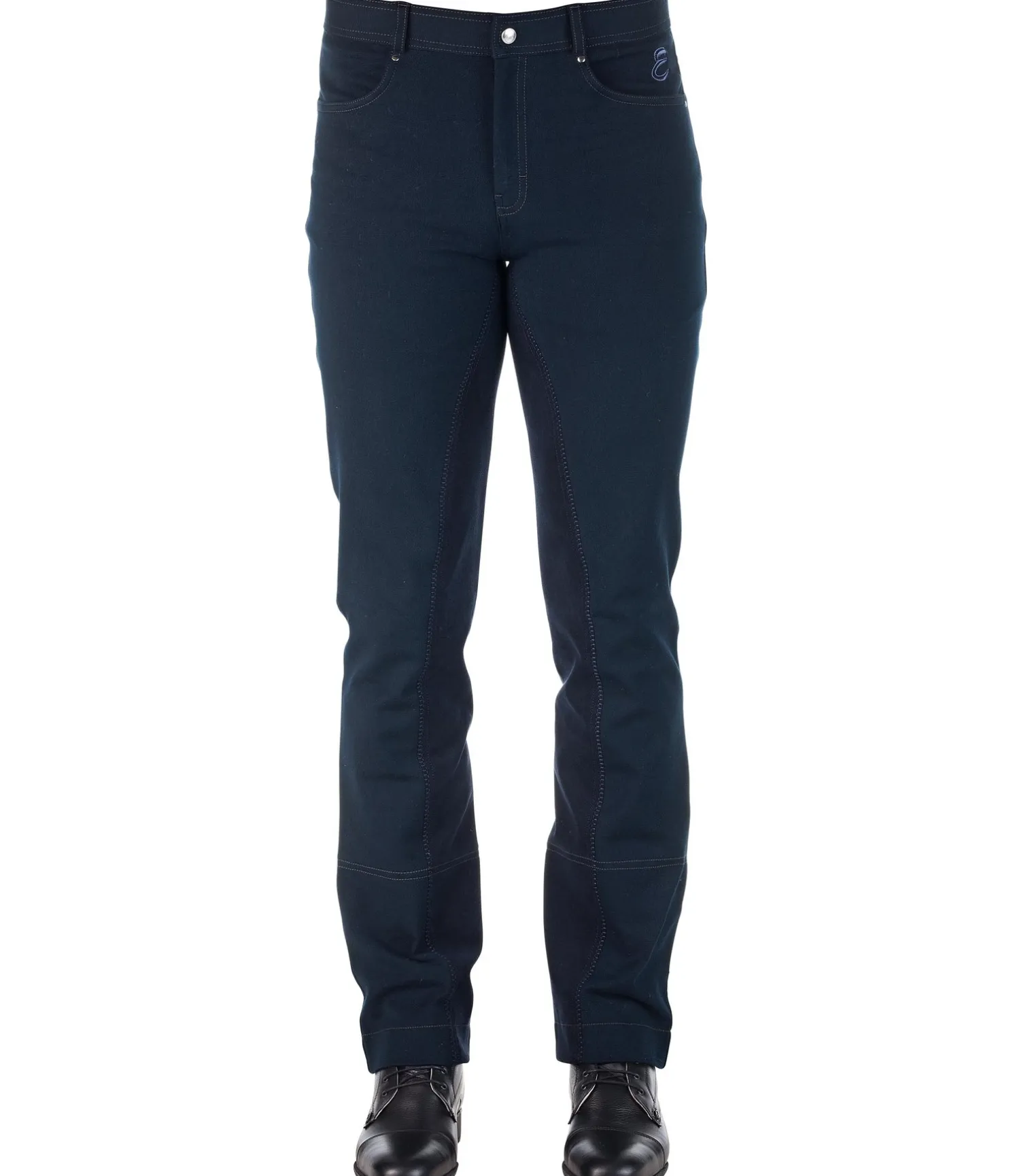 Pantalon d’équitation. Fond intégral jusqu’au bas des jambes. Aspect jean. Coupe Bootcut. Sous-pieds élastiqués réglables. 2 poches avant. 2 poches arrière. 95 % coton, 5 % élasthanne.
