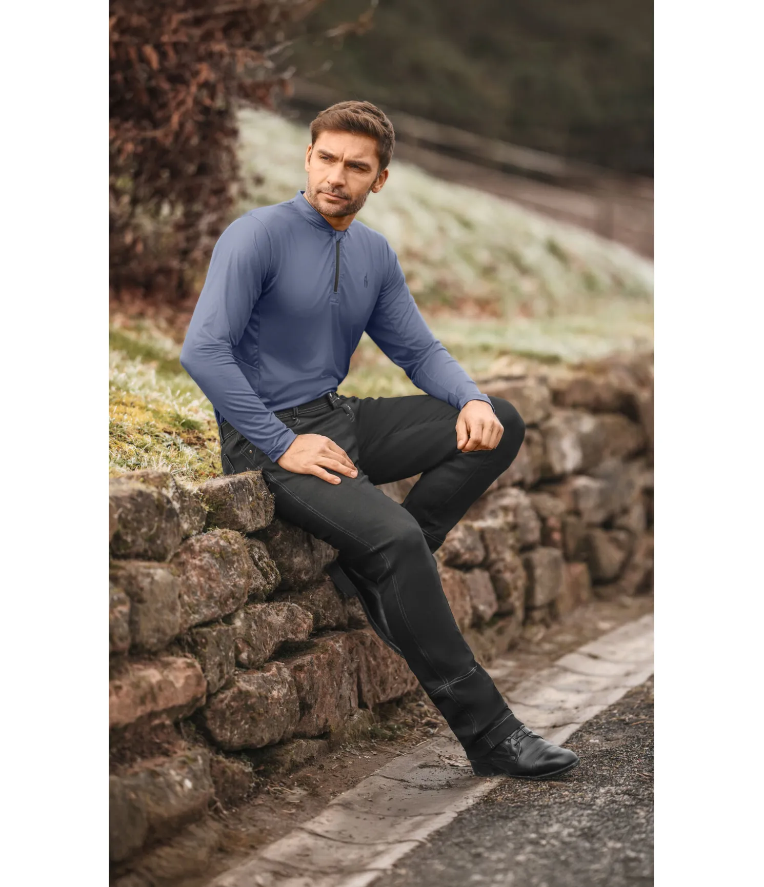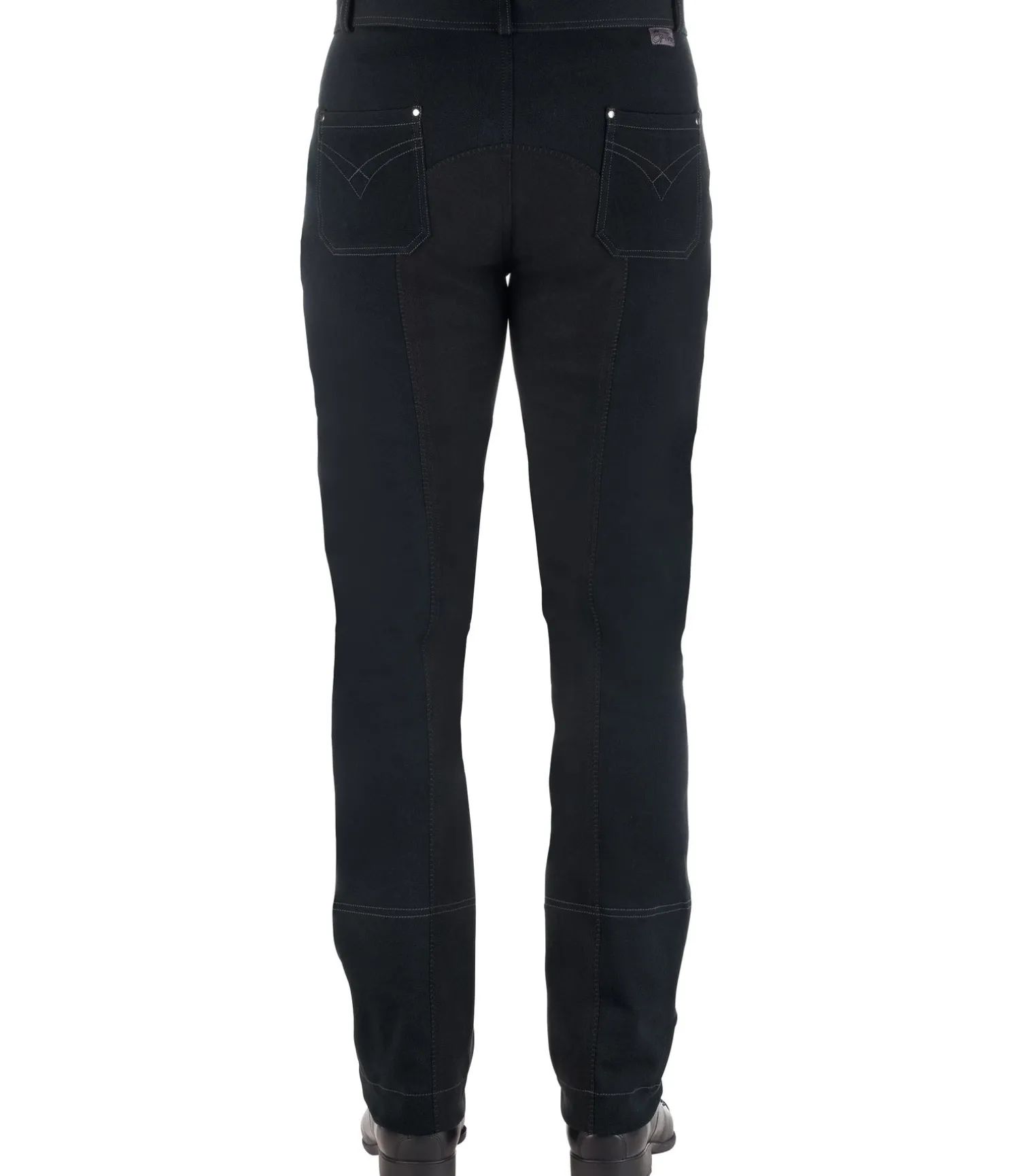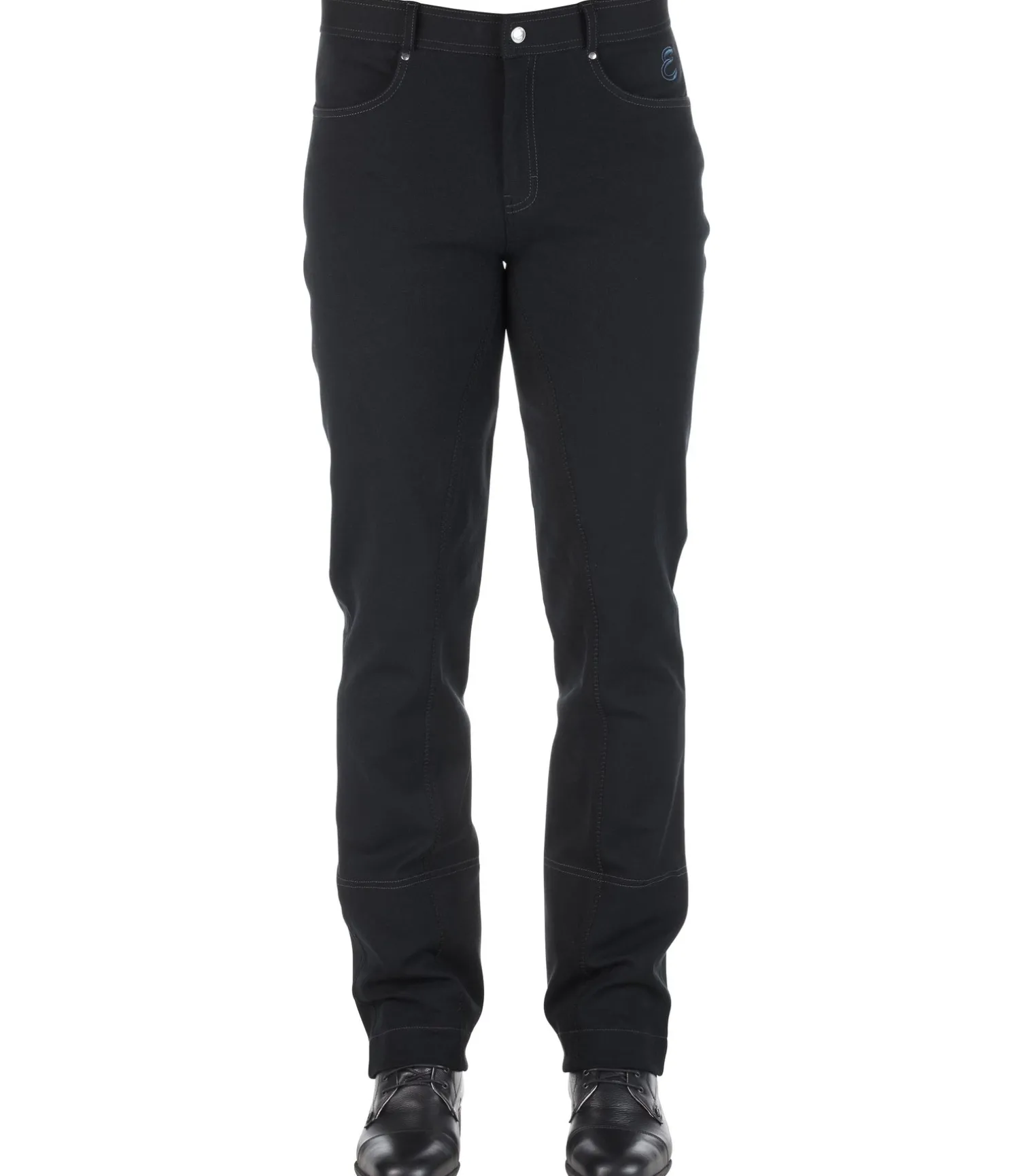 Pantalon d’équitation. Fond intégral jusqu’au bas des jambes. Aspect jean. Coupe Bootcut. Sous-pieds élastiqués réglables. 2 poches avant. 2 poches arrière. 95 % coton, 5 % élasthanne.