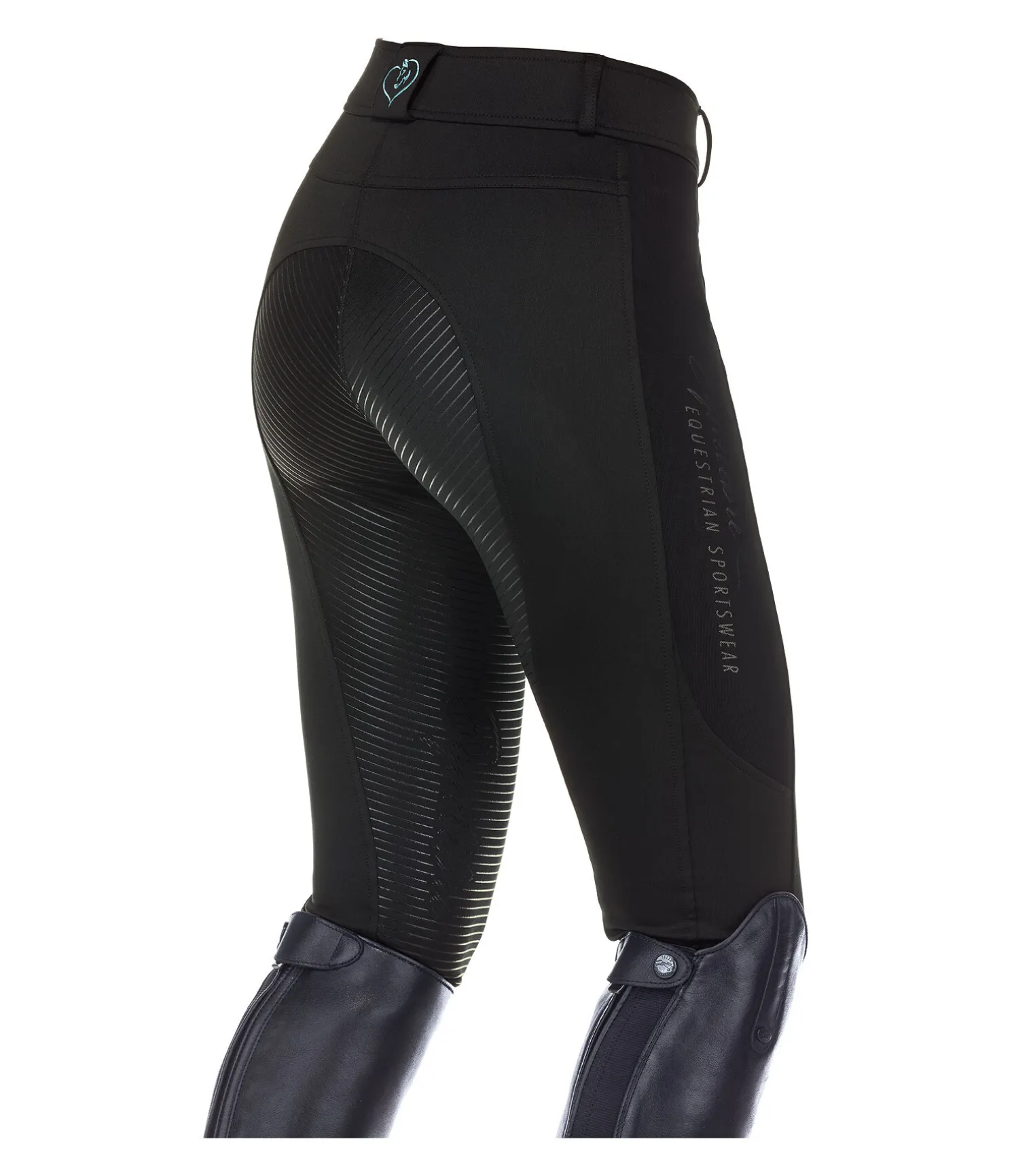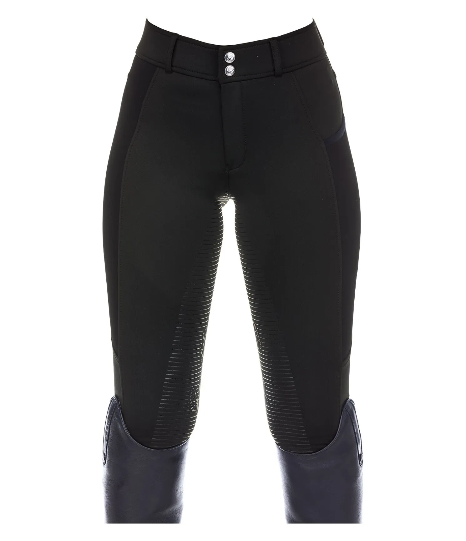 Pantalon d’équitation d’hiver thermique à fond intégral grip en silicone. Matière stretch respirante et extensible dans 4 directions. Séchage rapide. Intérieur molletonné. Ceinture élastiquée avec passants. Poche latérale pour téléphone portable. Inserts latéraux en mesh avec inscriptions et logo scintillants. 86 % polyester, 14 % élasthanne.