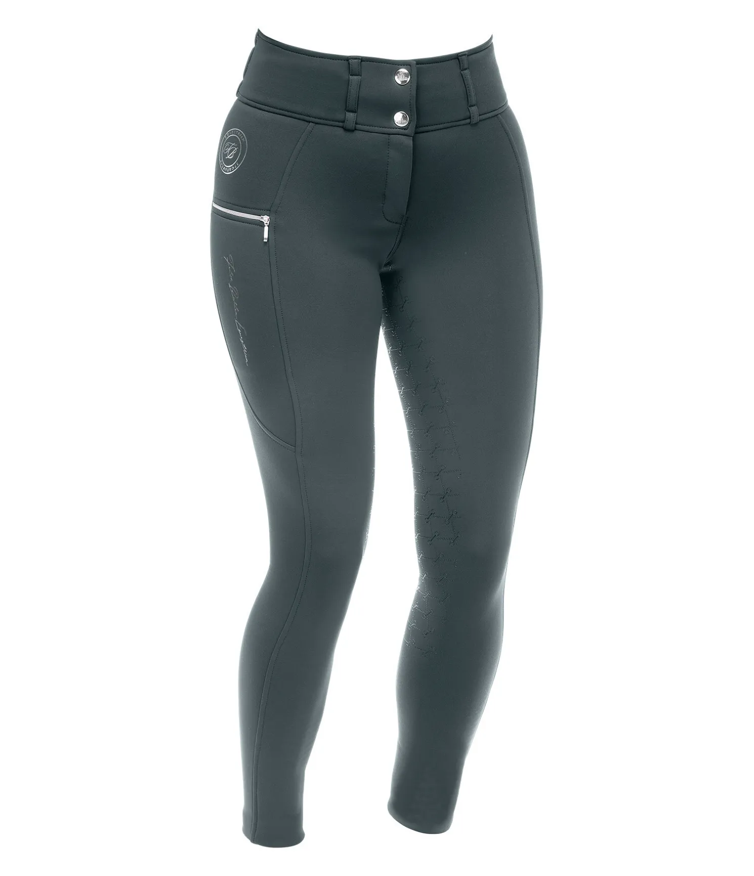 Pantalon d’équitation thermique avec fond intégral grip en silicone. Matière stretch respirante, extensible dans 4 directions. Séchage rapide. Intérieur molletonné. Imprimés Felix Bühler. Ceinture large avec passants. Une poche latérale zippée pour téléphone portable et une poche arrière zippée. Aucune couture au niveau des genoux. Bas de jambe extensible. 60 % polyester, 33 % polyamide, 7 % élasthanne.
