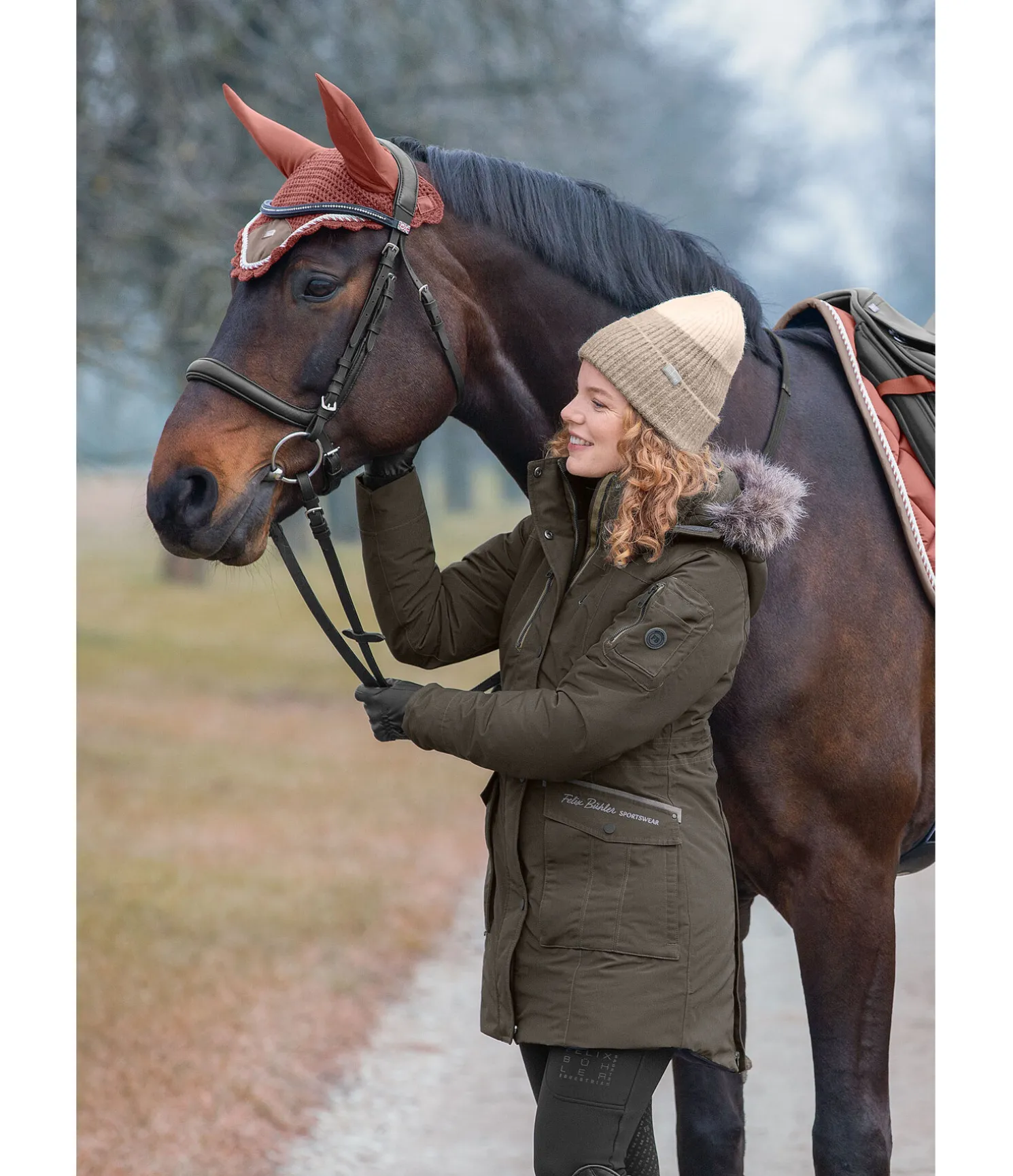 Parka d’équitation très chaude, solide et résistante aux intempéries. Capuche réglable et amovible par fermeture à glissière, pouvant être fixée dans le dos. Sa bordure en fausse « fourrure » est elle aussi amovible. Imperméable (10.000 mm), coupe-vent et respirante. Garnissage matelassé chaud en imitation duvet doux. 2 grandes poches à rabat avec poche latérale. 1 poche de poitrine zippée, 1 poche zippée sur la manche, 1 poche intérieure zippée, fermeture à glissière double sens dissimulée devant, 2 fentes cavalières zippées avec sous-patte à l’arrière, cordon de serrage à la taille, bas des manches avec finition bord-côte coupe-vent. Broderie et badge Felix Bühler. 100 % polyester.