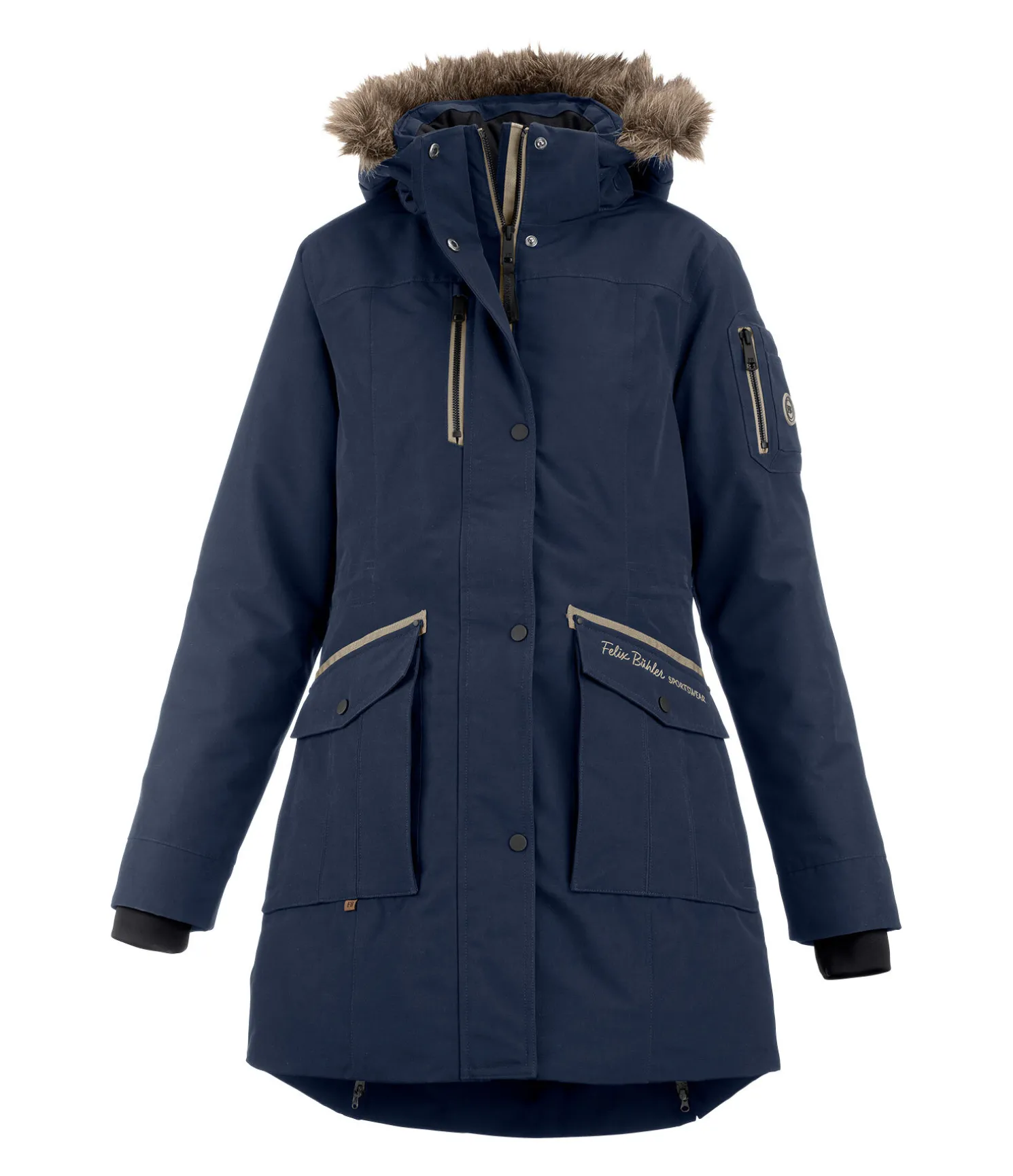 Parka d’équitation très chaude, solide et résistante aux intempéries. Capuche réglable et amovible par fermeture à glissière, pouvant être fixée dans le dos. Sa bordure en fausse « fourrure » est elle aussi amovible. Imperméable (10.000 mm), coupe-vent et respirante. Garnissage matelassé chaud en imitation duvet doux. 2 grandes poches à rabat avec poche latérale. 1 poche de poitrine zippée, 1 poche zippée sur la manche, 1 poche intérieure zippée, fermeture à glissière double sens dissimulée devant, 2 fentes cavalières zippées avec sous-patte à l’arrière, cordon de serrage à la taille, bas des manches avec finition bord-côte coupe-vent. Broderie et badge Felix Bühler. 100 % polyester.