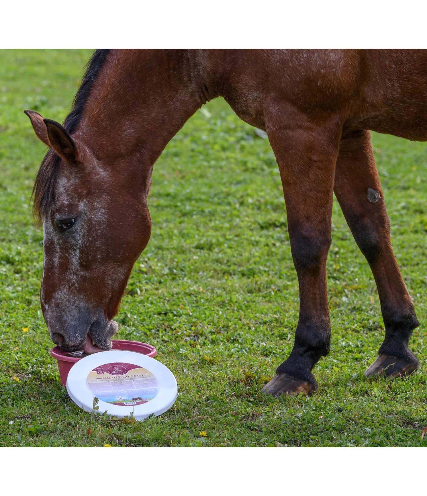 Mélange de minéraux, de vitamines et d’oligo-éléments (aliment complémentaire pour chevaux). Couvre les besoins journaliers en minéraux, vitamines et oligo-éléments essentiels. Des compléments minéraux ou des aliments concentrés minéralisés ne sont alors plus nécessaires. Complément idéal pour les chevaux vivant au pré, car les herbes présentes dans les pâtures ne suffisent souvent pas à couvrir les besoins en minéraux des chevaux à elles seules. La pierre à lécher est fixée dans une boîte en plastique rigide réutilisable avec couvercle moulé adapté, dans une optique de réduction des déchets.