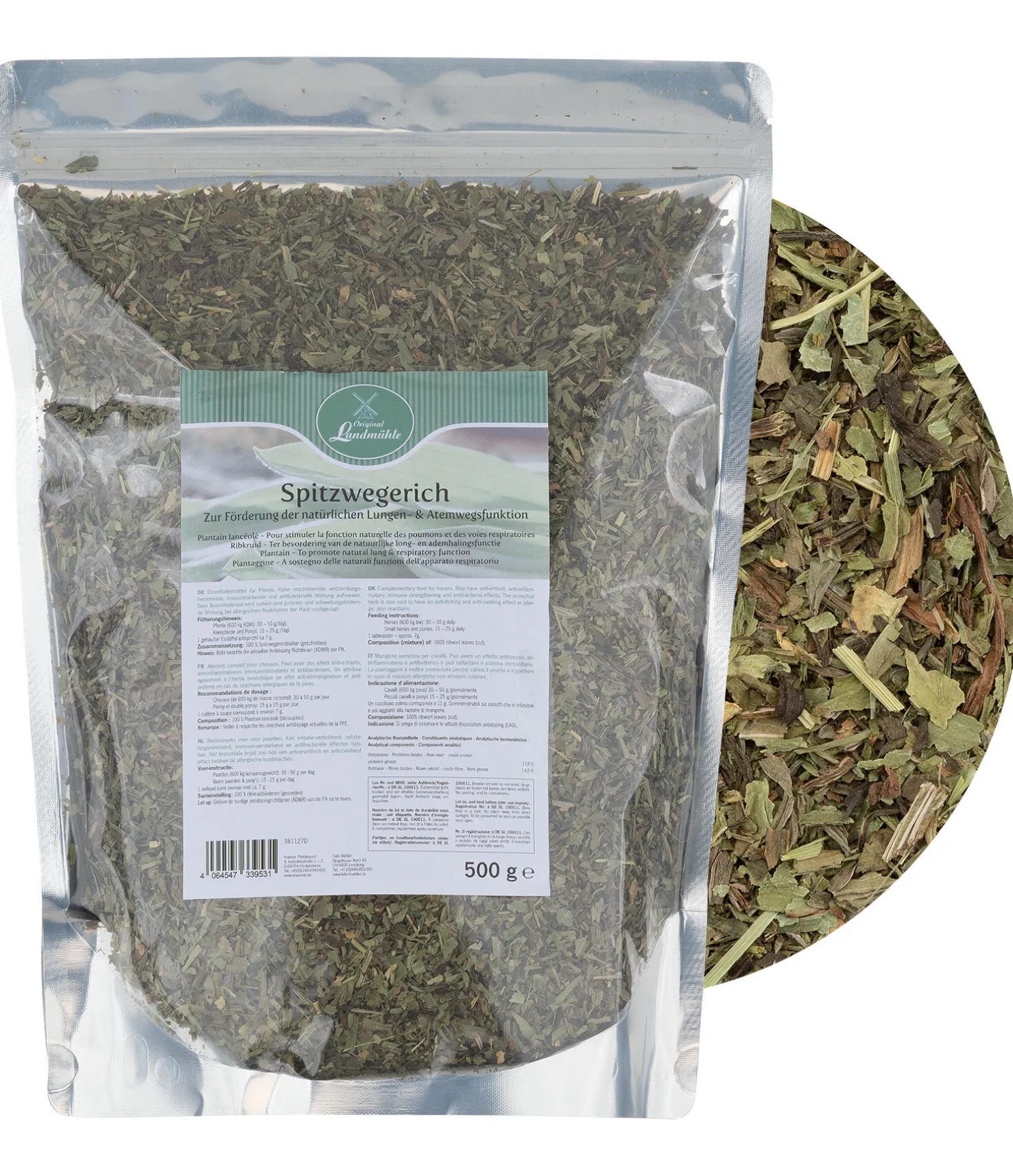 Composition : 100 % feuilles de plantain (hachées).