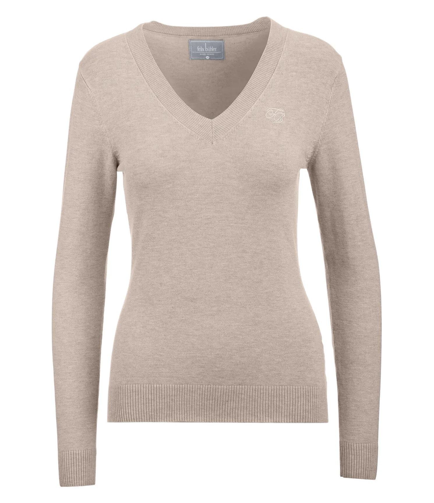 Pull classique avec col en V. Matière douce. Discrète broderie Felix Bühler sur la poitrine. Finition bord-côte à la taille, au col et aux poignets. 80 % viscose, 20 % nylon.