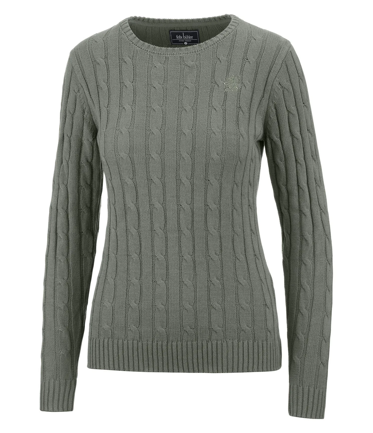 Pull-over à col rond classique et doux en tricot torsadé. Broderie Felix Bühler sur la poitrine. Bordure côtelée en bas des manches et à la taille. 60 % coton, 40 % polyacrylique.
