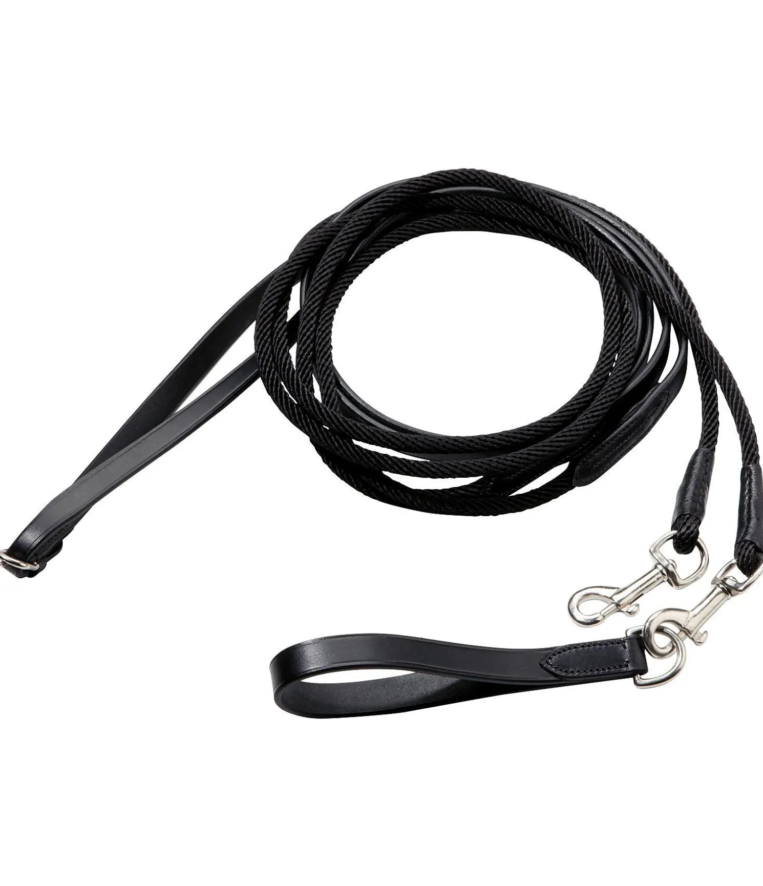 Rênes allemandes en nylon avec boucle pour la sangle et mousqueton. Rapides et faciles à installer. Rênes et zone du poitrail en revêtement synthétique. Partie médiane en cordon nylon torsadé. Noir.