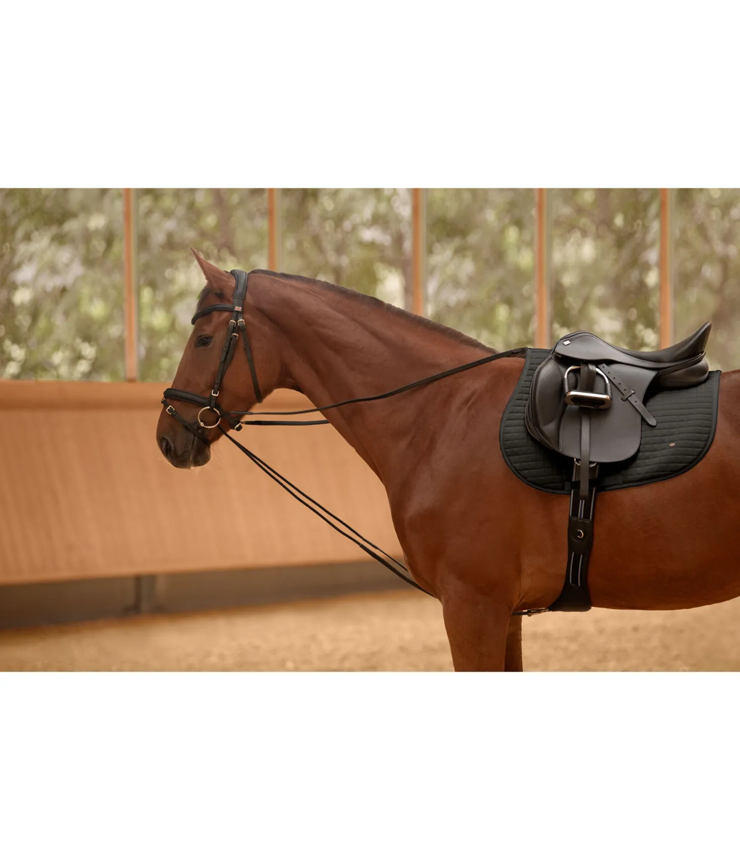 Les rênes allemandes se composent de deux rênes. Elles se fixent entre les antérieurs à la sangle puis passent dans les anneaux du mors, de l’intérieur vers l’extérieur, pour venir dans les mains du cavalier. Enrênement non autorisé en compétition.