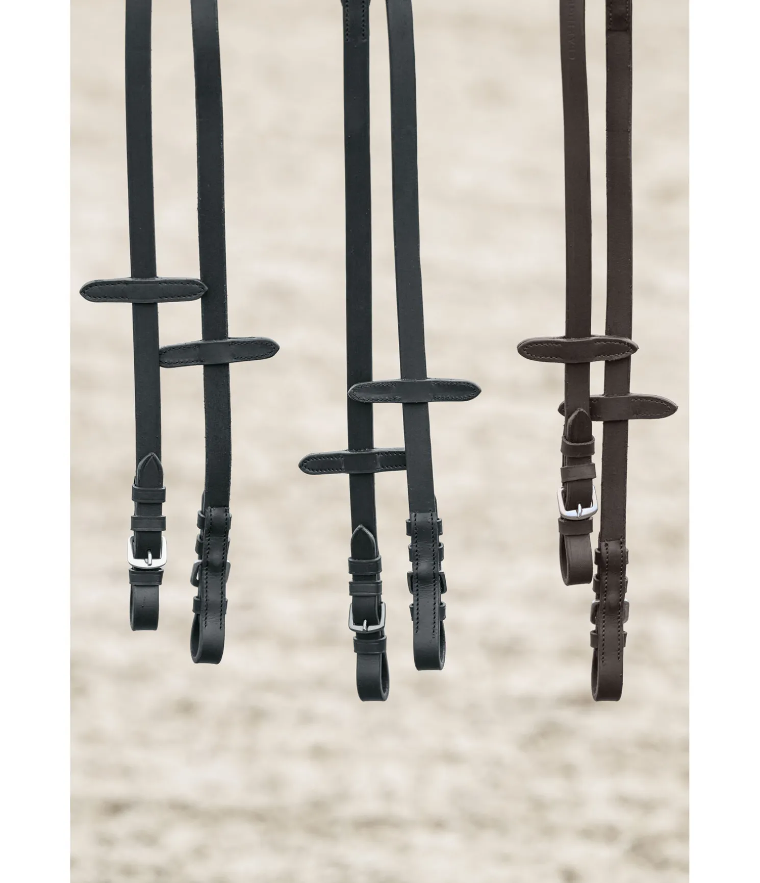 Rênes en cuir véritable particulièrement agréables en main avec revêtement en caoutchouc antidérapant. Avec arrêtoirs en cuir et arrêtoirs de martingale. Largeur : 1,9 cm.