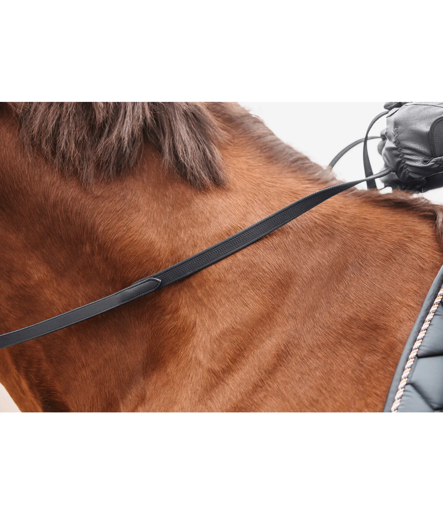 Rênes en cuir véritable agréables en main. Revêtement caoutchouté antidérapant et extrémités en cuir gras particulièrement souple. Arrêtoirs de martingale. Bouclerie argentée. Largeur 1,9 cm, longueur : C (poney) = 280 cm, F (cheval)= 290 cm.