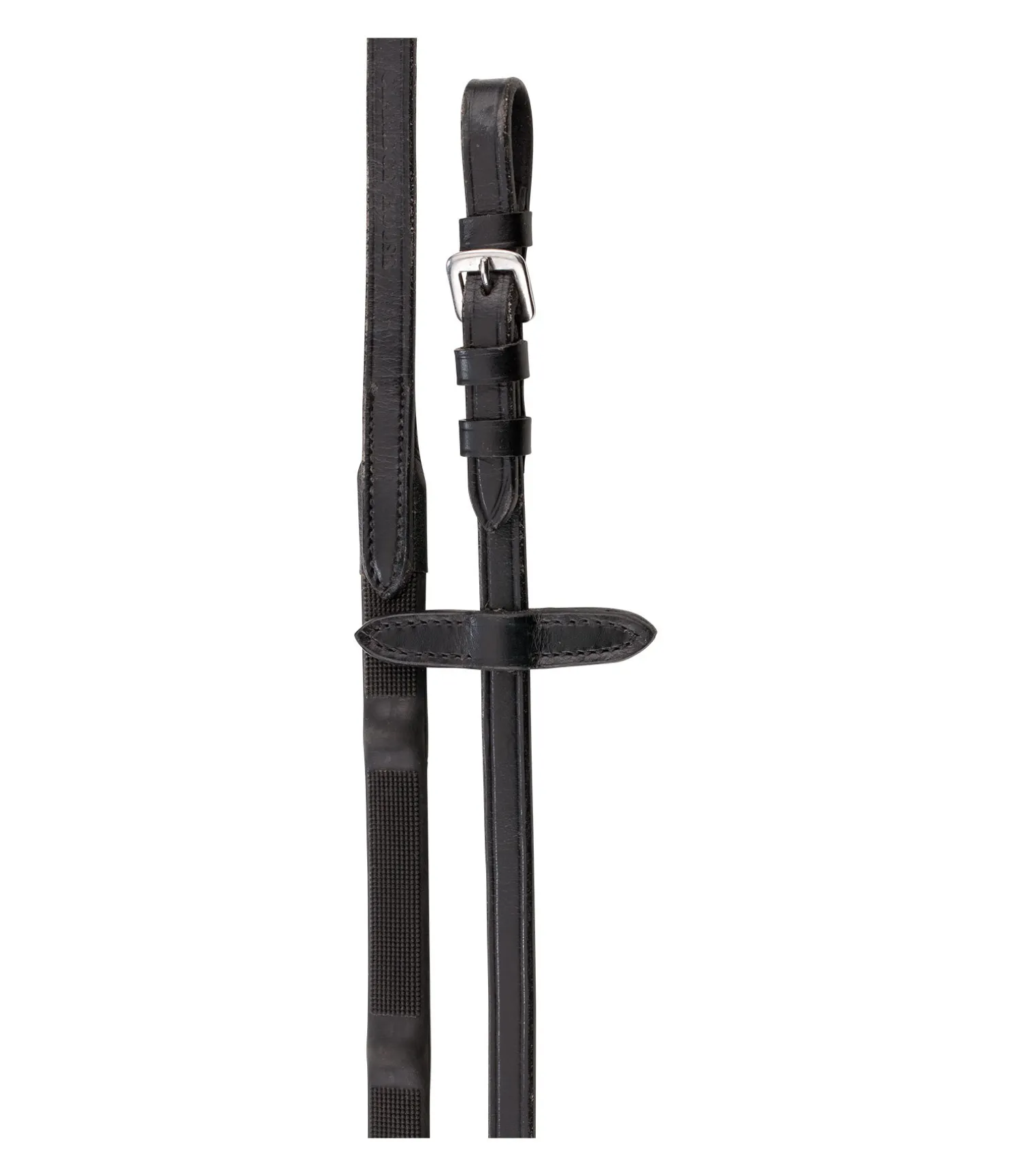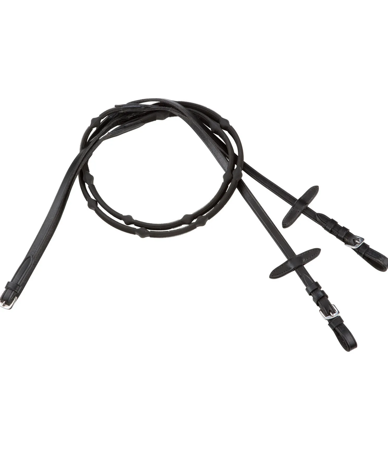 Rênes en caoutchouc avec arrêtoirs Soft Stops et espaces en caoutchouc adhérent pour une bonne prise en main. Avec arrêtoirs de martingale. Bouclerie argentée. Largeur 1,9 cm.