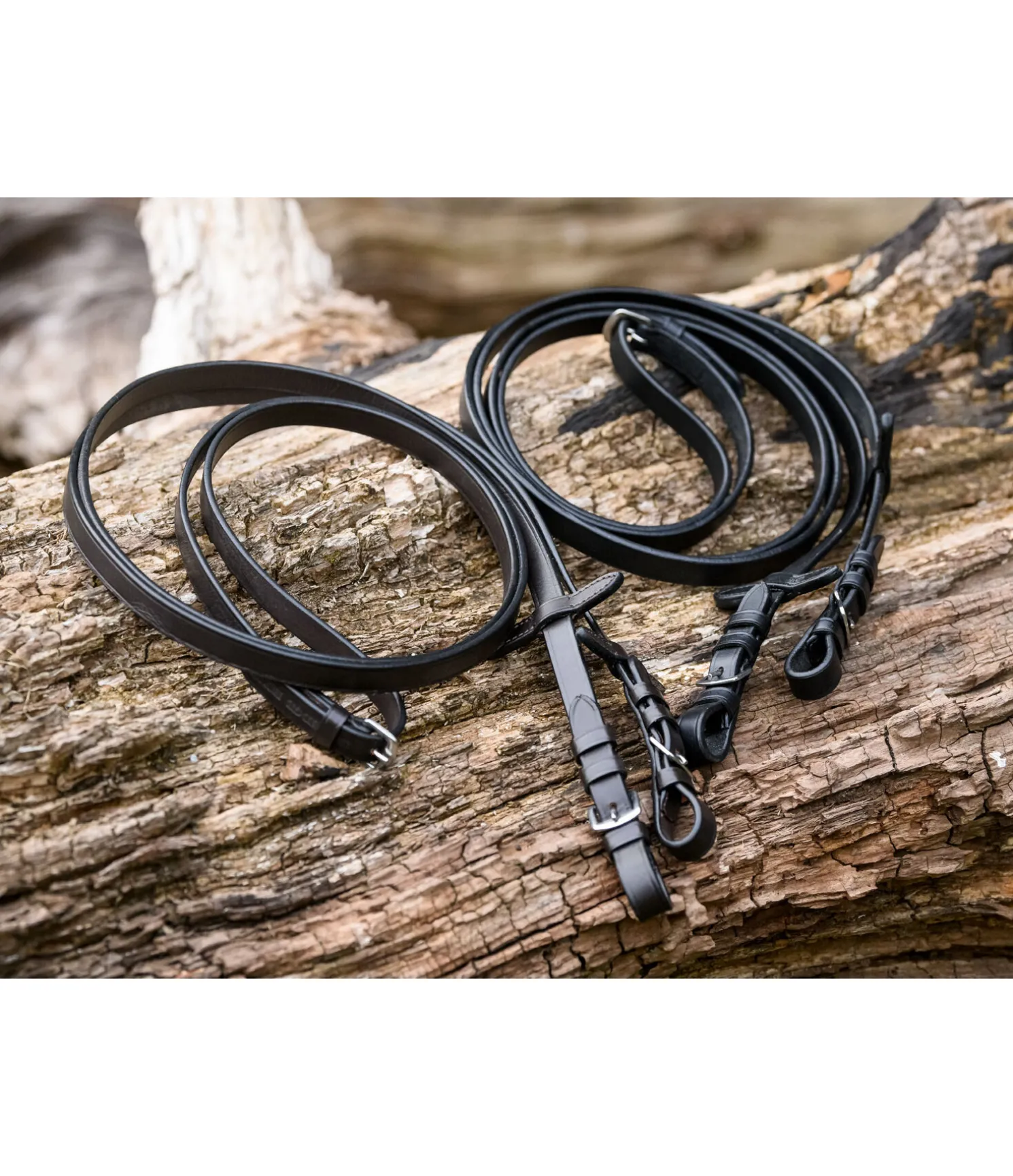 Rênes classiques et fines en cuir véritable. Fabriquées en cuir gras de qualité, particulièrement souple. Avec arrêtoirs de martingale et bouclerie argentée en acier inoxydable. 290 x 1,7 cm.