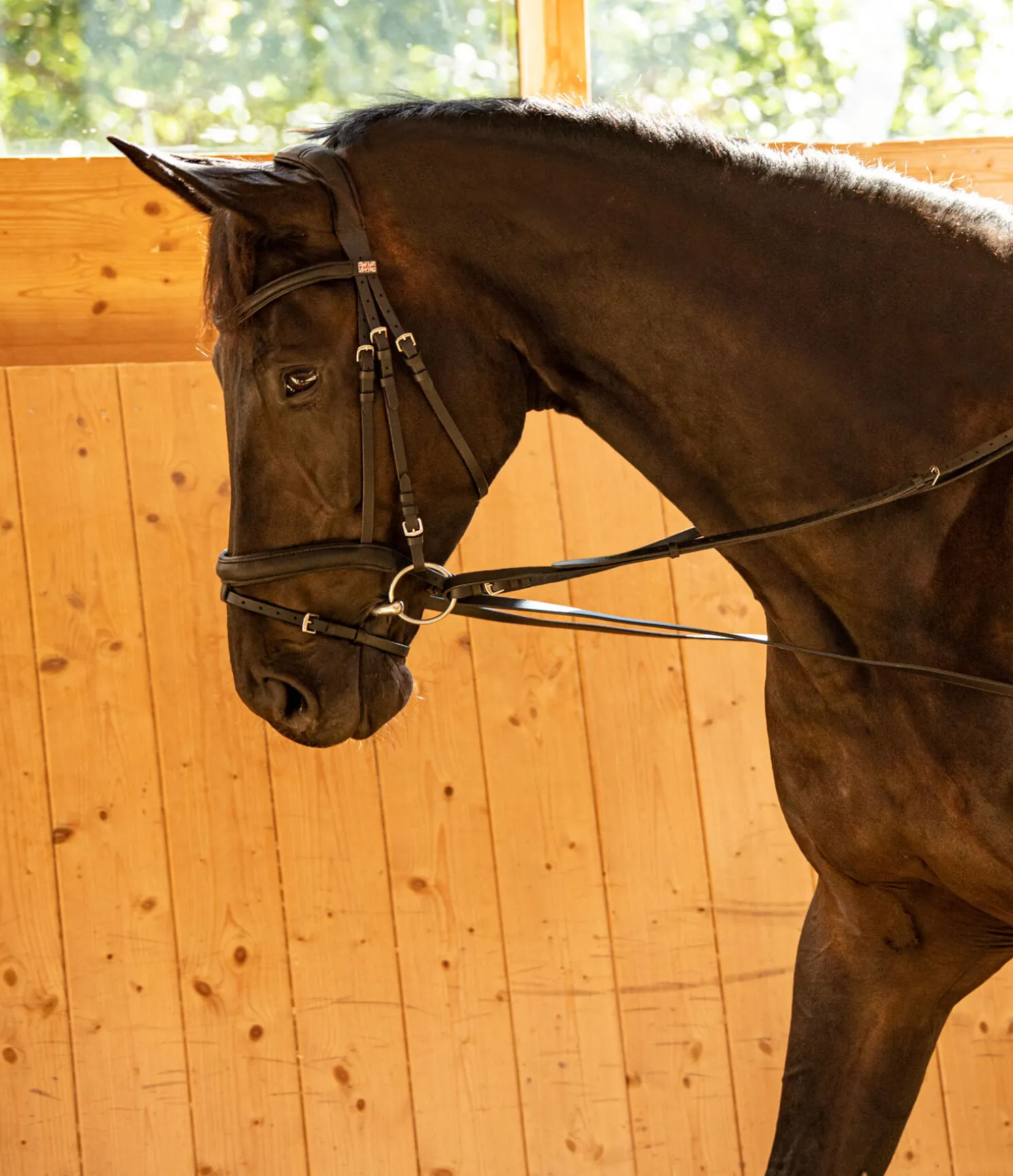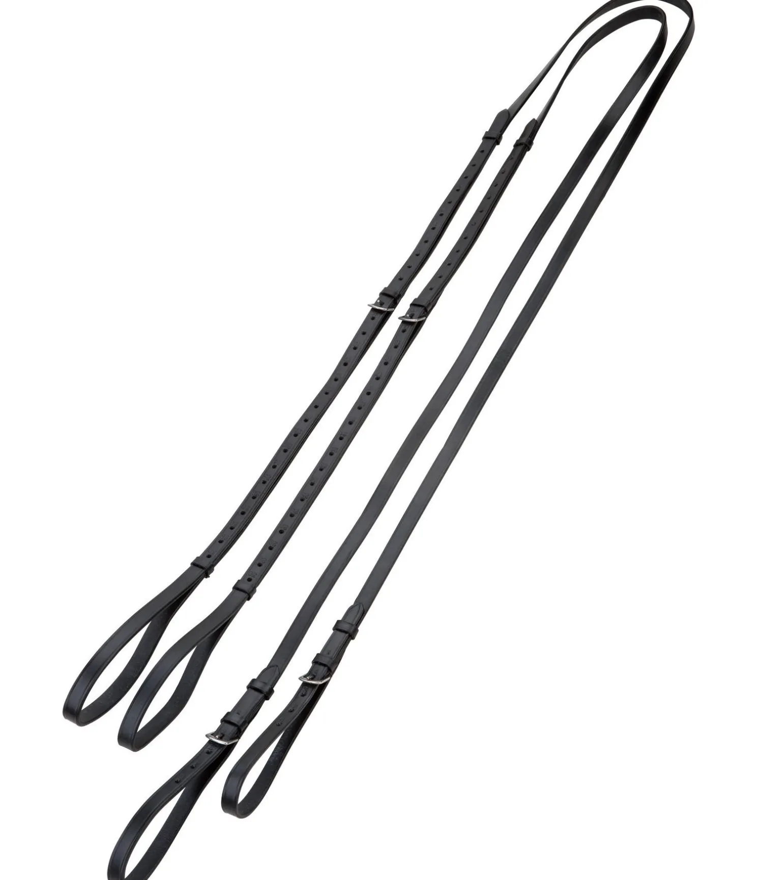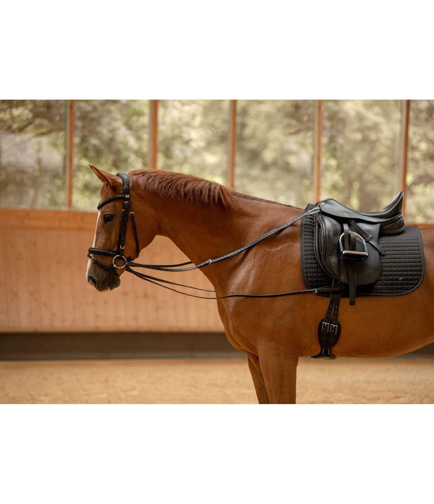 Les rênes viennoises sont principalement appropriées pour le travail à la longe et peuvent facilement se fixer aux anneaux du surfaix. Pour le travail monté, la longue rêne d’env. 2,25 m doit être fixée de chaque côté des quartiers grâce aux boucles. Elle passe ensuite dans les anneaux du mors, de l’intérieur vers l’extérieur, pour venir se fixer à la sangle grâce aux deux boucles, et ainsi éviter de glisser vers le bas. (doit se placer au dessus du passant de sangle fixé à la chabraque)