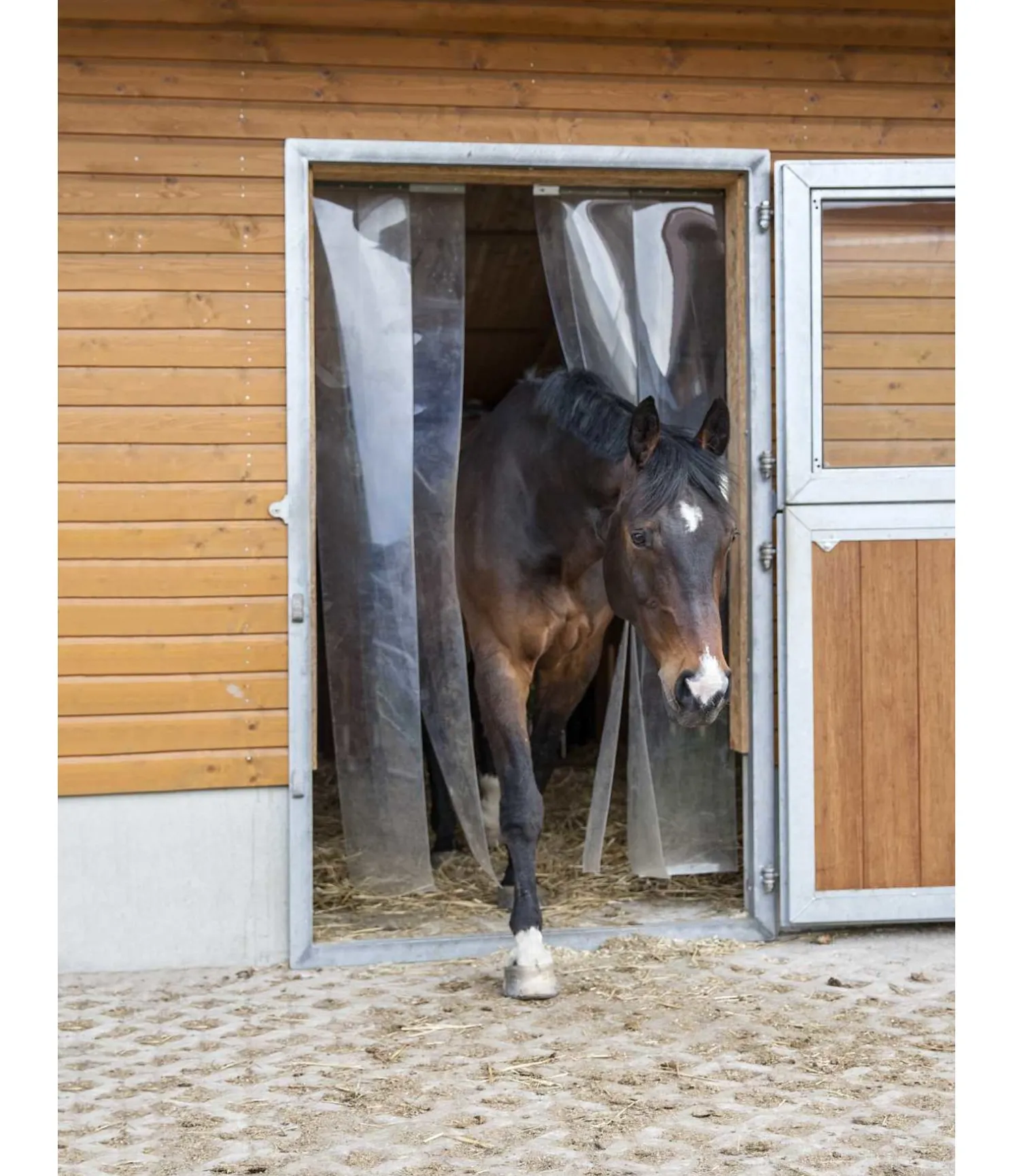 Une protection de box optimale contre le vent, le froid et les mouches. Les bandes en plastique résistant sont transparentes et laissent ainsi parfaitement passer la lumière. D’une épaisseur d’environ 3 mm, les bandes de plastique ont des bords arrondis pour éviter les risques de coupure ! Prémontées, elles sont faciles à installer grâce à leur système de montage rapide. Le rail de support peut être fixé sur la porte ou sous le linteau. Les bandes sont indépendantes les unes des autres ce qui permet de les placer selon vos souhaits. Pour les nettoyer, il suffit de les décrocher, ce qui est simple à effectuer. Le rail de support a une longueur d’environ 130 cm. Les bandes font 30 cm de large et 225 cm de long. Elles peuvent être raccourcies en fonction des besoins. Les bandes se chevauchent sur env. 5,5 cm ce qui assure une protection optimale contre les intempéries. Des bandes supplémentaires peuvent être commandées à l’unité (Réf. 431 666). Le kit comprend un rail de support et 5 bandes en plastique.