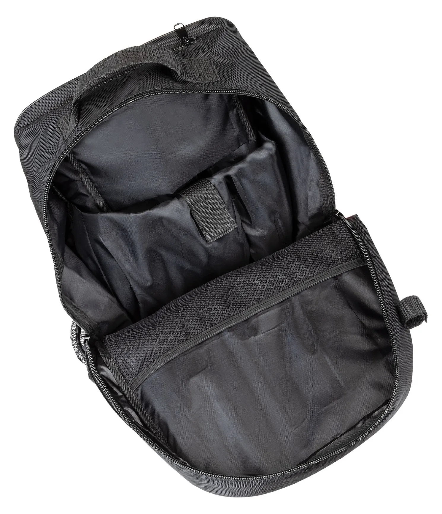 Sac à dos d’équitation pratique et élégant avec compartiment extérieur pour le casque. Conçu en nylon robuste. Doté de deux poches latérales extensibles pour ranger facilement des bouteilles d’eau ou des produits de soin, d’une poche rembourrée pour smartphone et d’un petit compartiment latéral pour ranger la cravache. Grande poche zippée pour stocker un gilet ou autre. Grand compartiment intérieur avec espace de rangement pour la protection dorsale avec fermeture par patte auto-agrippante. Possibilité de ranger une paire de bottes d’équitation jusqu’à 38 cm (sac taille M) ou 50 cm (sac taille L). Bretelles rembourrées et réglables en longueur. Poignée de transport. Dimensions taille L : 35 x 52 x 17 cm – Dimensions taille M : 30 x 40 x 13 cm.