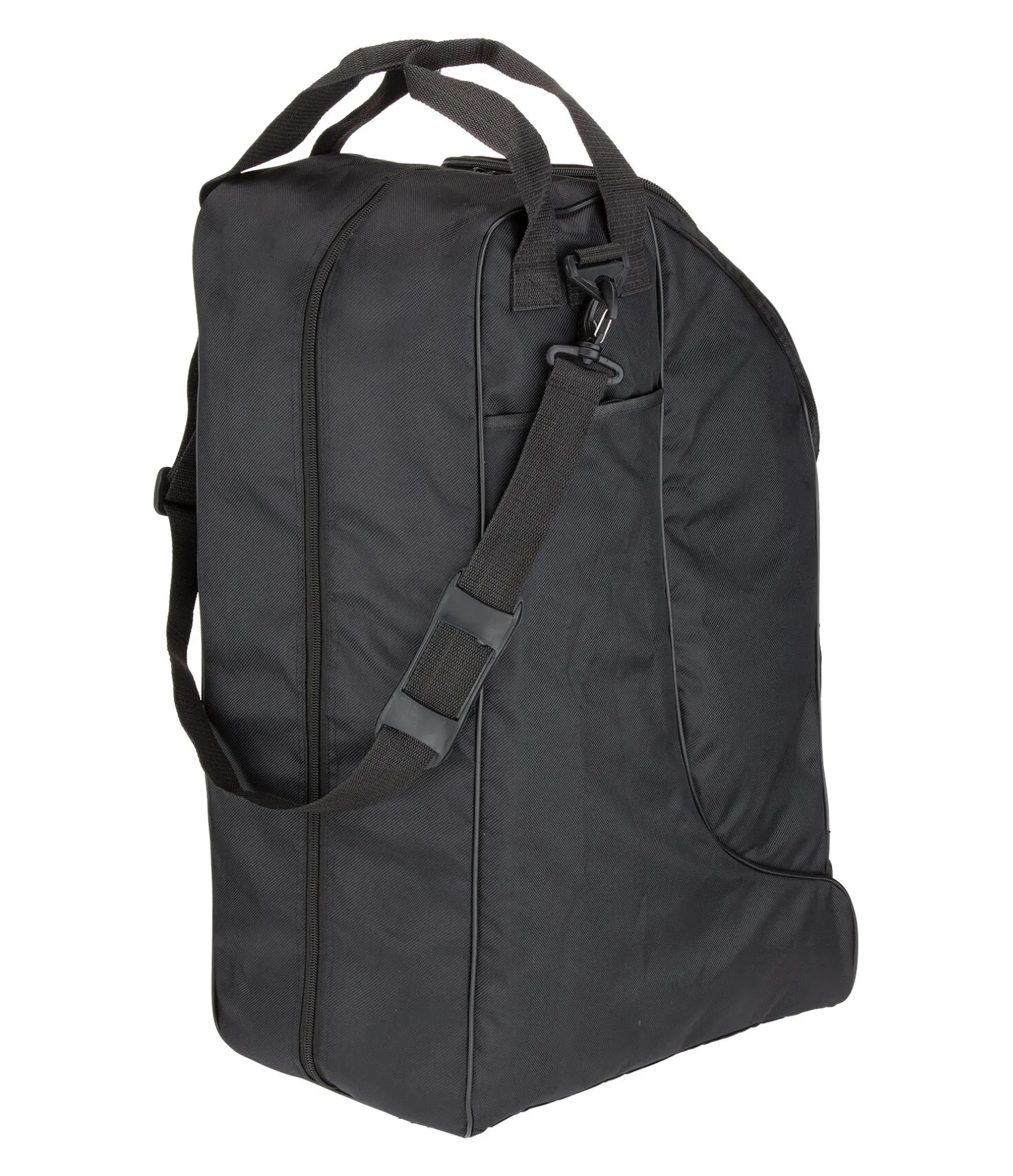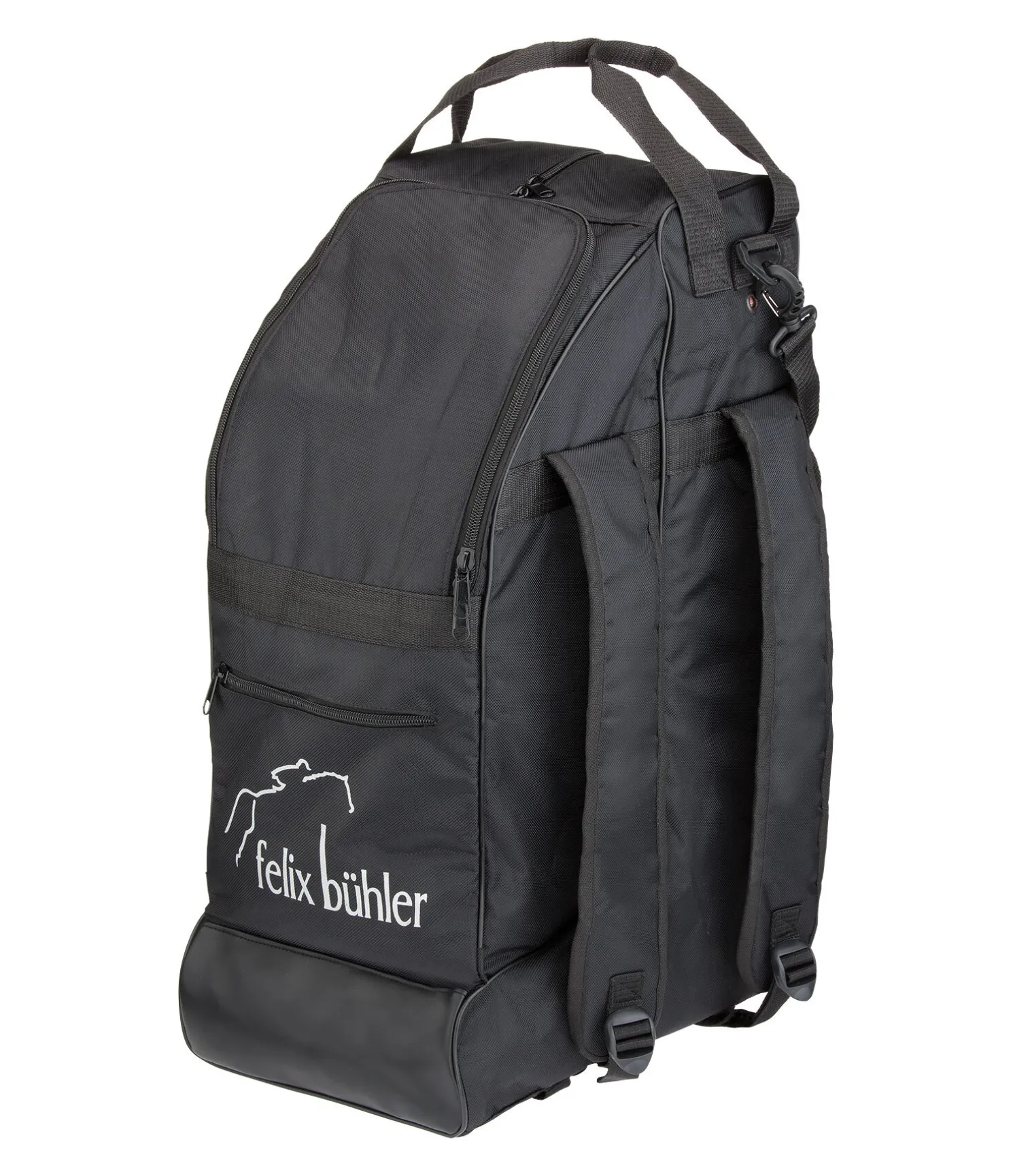 Sac à dos pour l’équitation en nylon résistant avec poche à l’avant rembourrée pour le casque d’équitation et la protection dorsale. Large compartiment pour les bottes d’équitation avec trous d’aération, petit compartiment pour les gants, les éperons, etc. ainsi qu’un compartiment plus long pour les cravaches. Le sac dispose d’une longue bandoulière et d’anses en plus de ses bretelles rembourrées réglables. Points d’appui en caoutchouc sur le dessous pour éviter une usure prématurée. 35 x 60 x 25 cm.