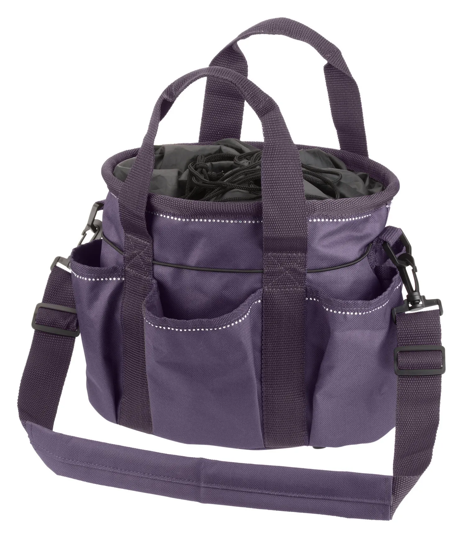 Élégant sac de pansage orné de strass en matière anti-salissures. 6 poches extérieures, 2 poignées et une bandoulière amovible. Fermeture du sac par cordon de serrage. Dimensions : 28 x 18 x 25 cm.