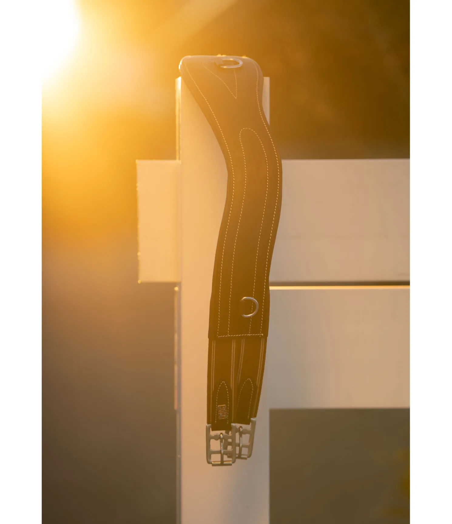 Sangle en cuir anatomique avec rembourrage doux, trois anneaux en D, empiècements élastiques des deux côtés et boucles à rouleau. Largeur 11 cm.