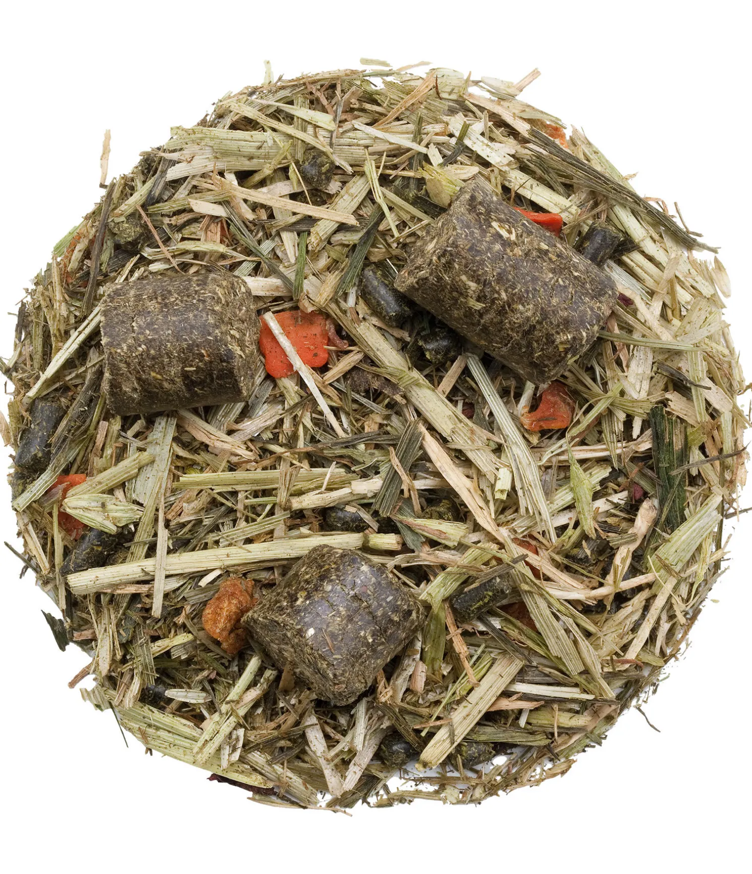 Composition : bouchons d’herbe de prairie, granulés de luzerne, herbe séchée, huile de lin, chips de carottes, paille, chips de betteraves rouges, souci .