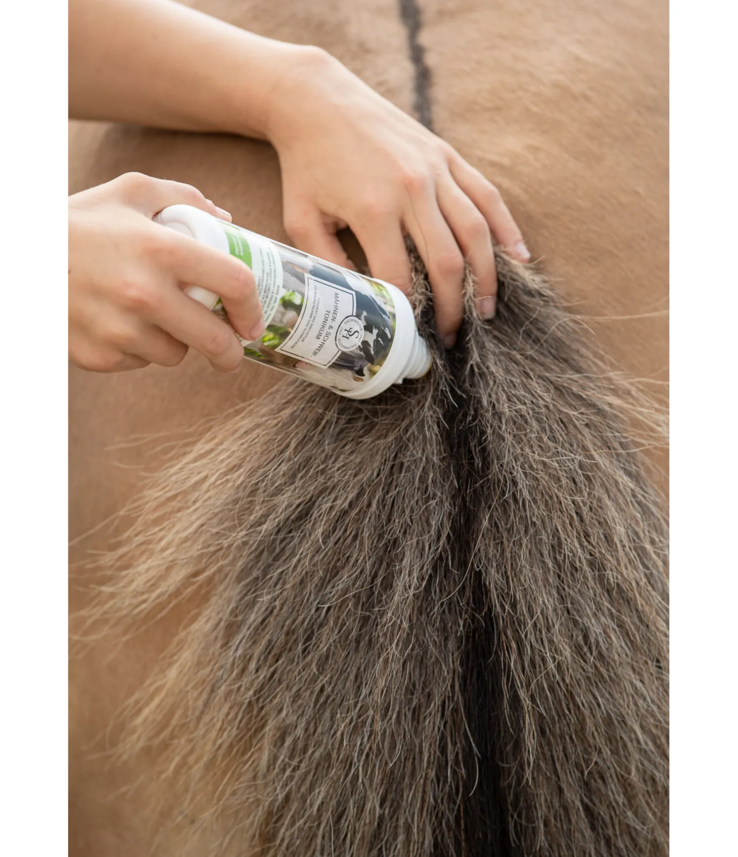 Conseils d’utilisation : agiter avant l’emploi. Appliquer directement sur les crins de la crinière ou de la queue et masser légèrement. Peut être appliqué quotidiennement. Conserver à l’abri du gel et de la chaleur