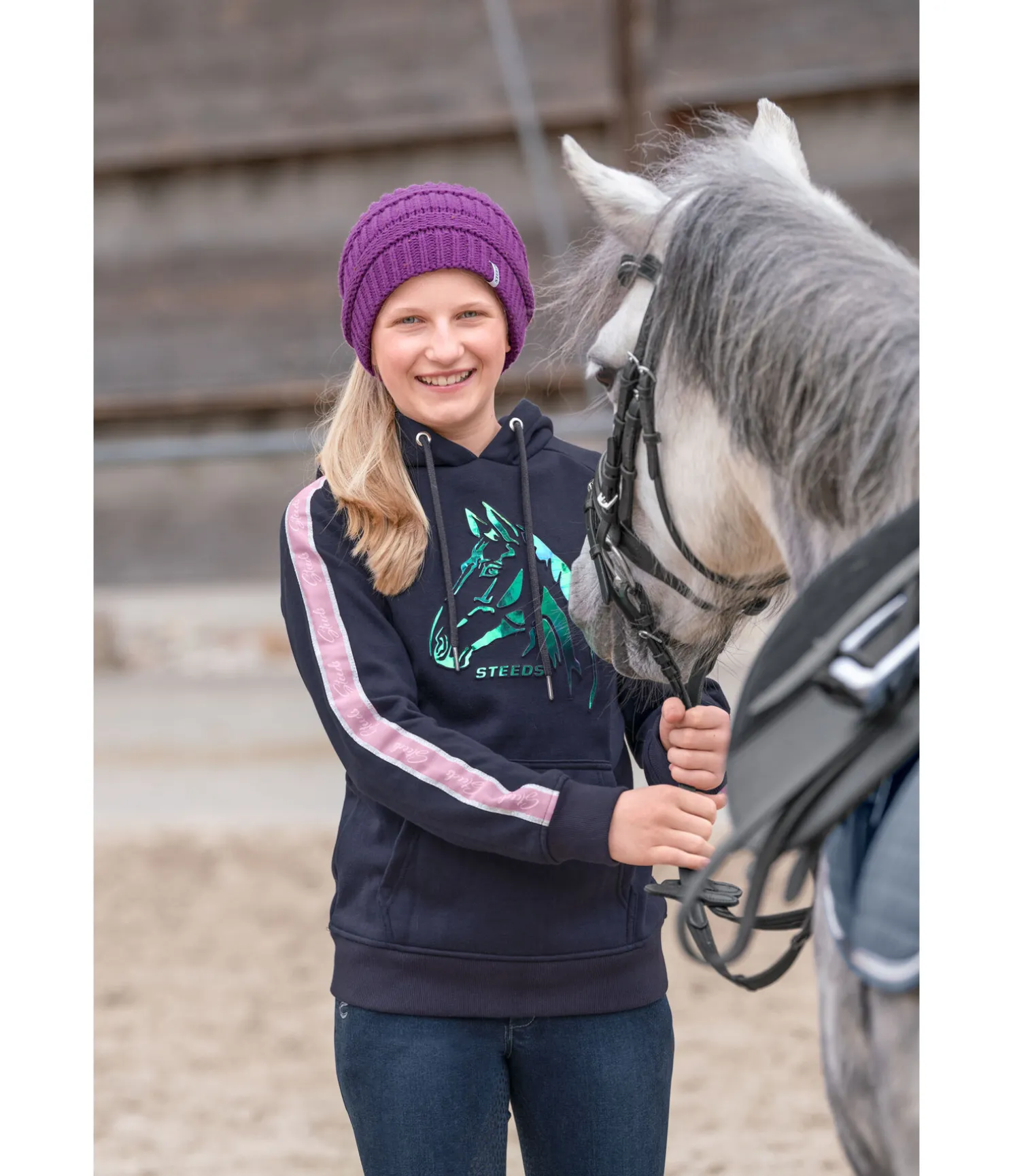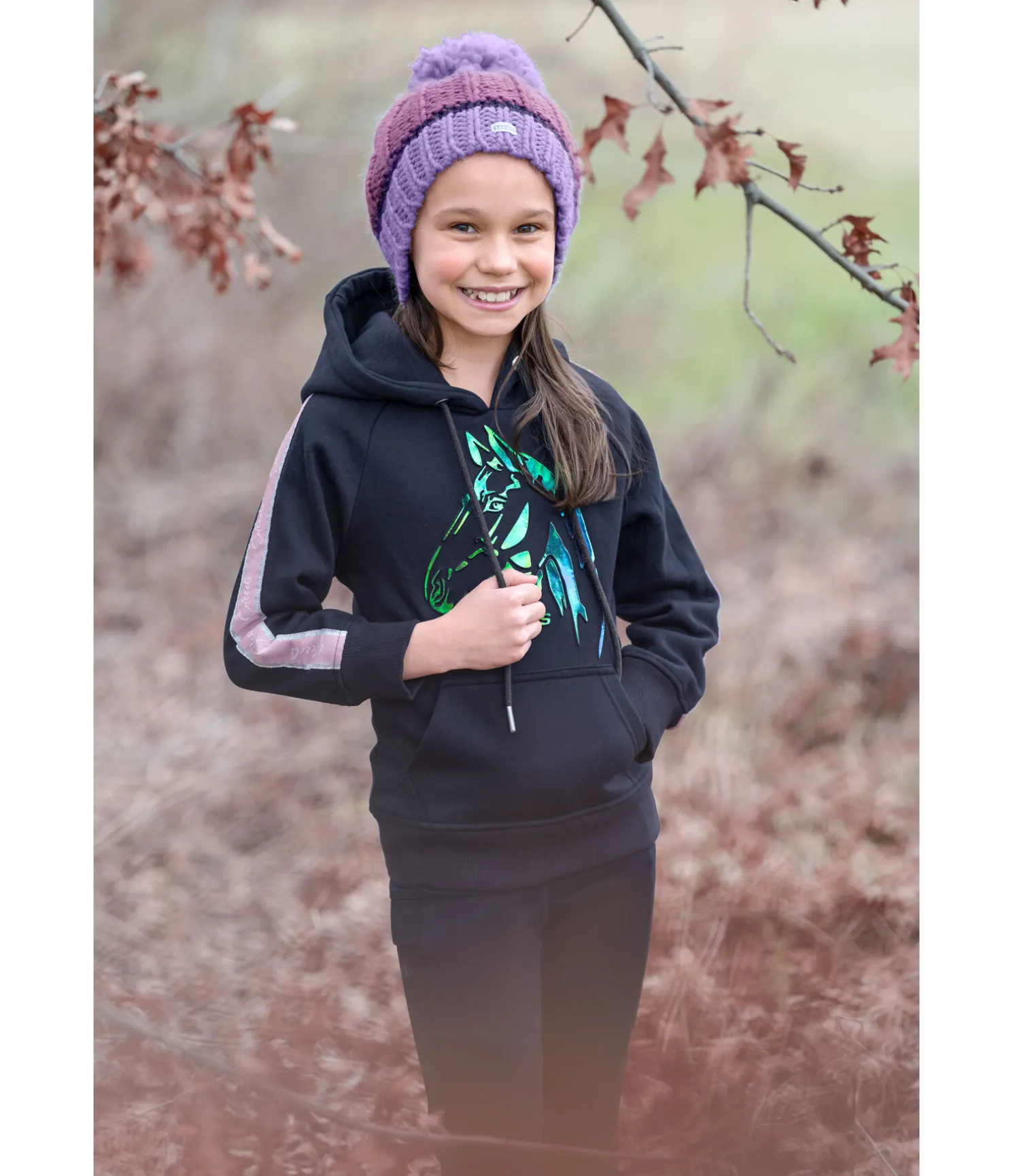 Sweat à capuche avec imprimé cheval en relief scintillant dans les couleurs de l’arc-en-ciel. Insert sur les manches de couleur contrastante avec logo et bord scintillant. Intérieur molletonné doux. Capuche réglable par cordon de serrage. Poche kangourou. Finition en bord-côte sur le bas des manches et l’ourlet. 65 % polyester, 35 % coton.