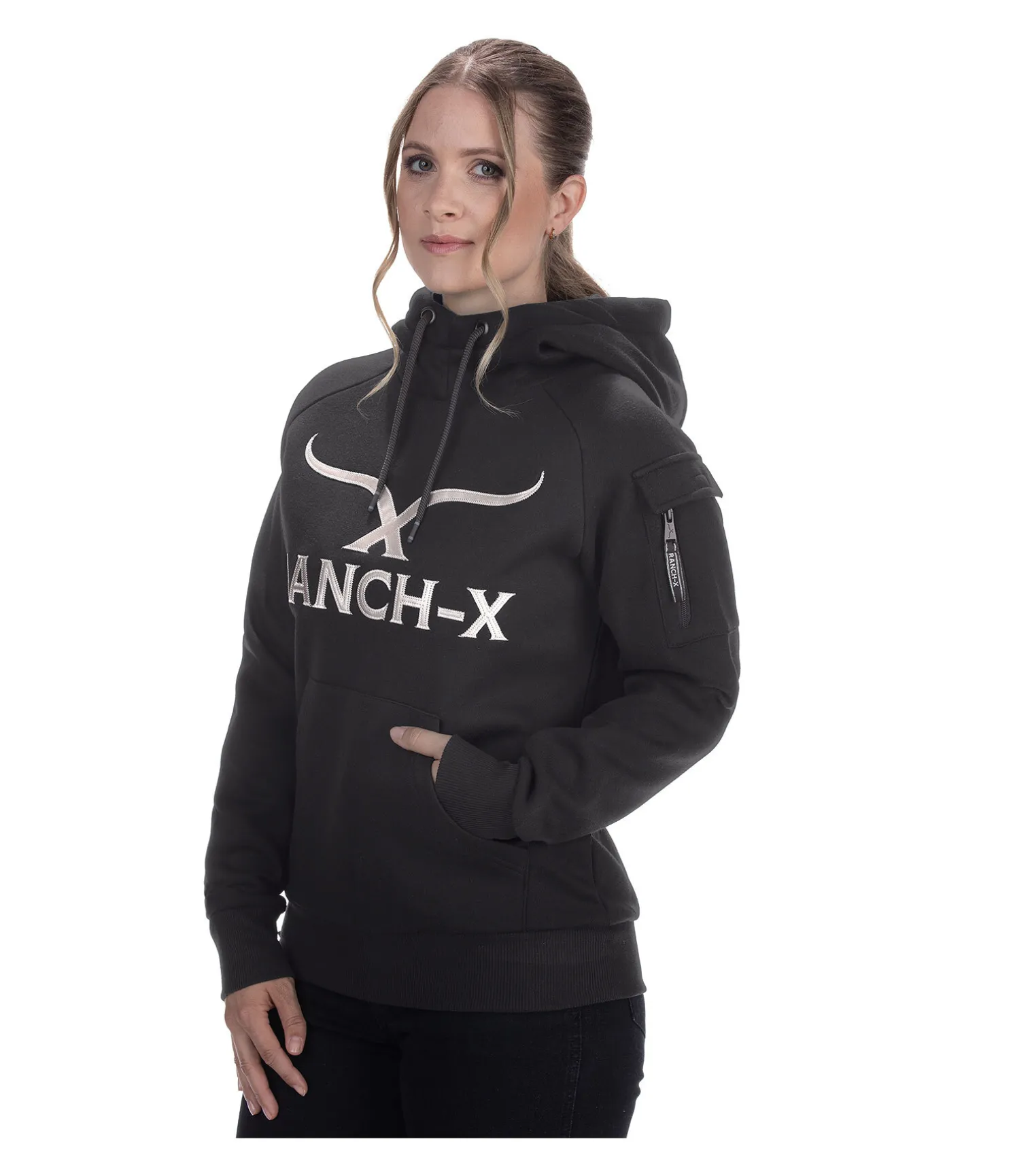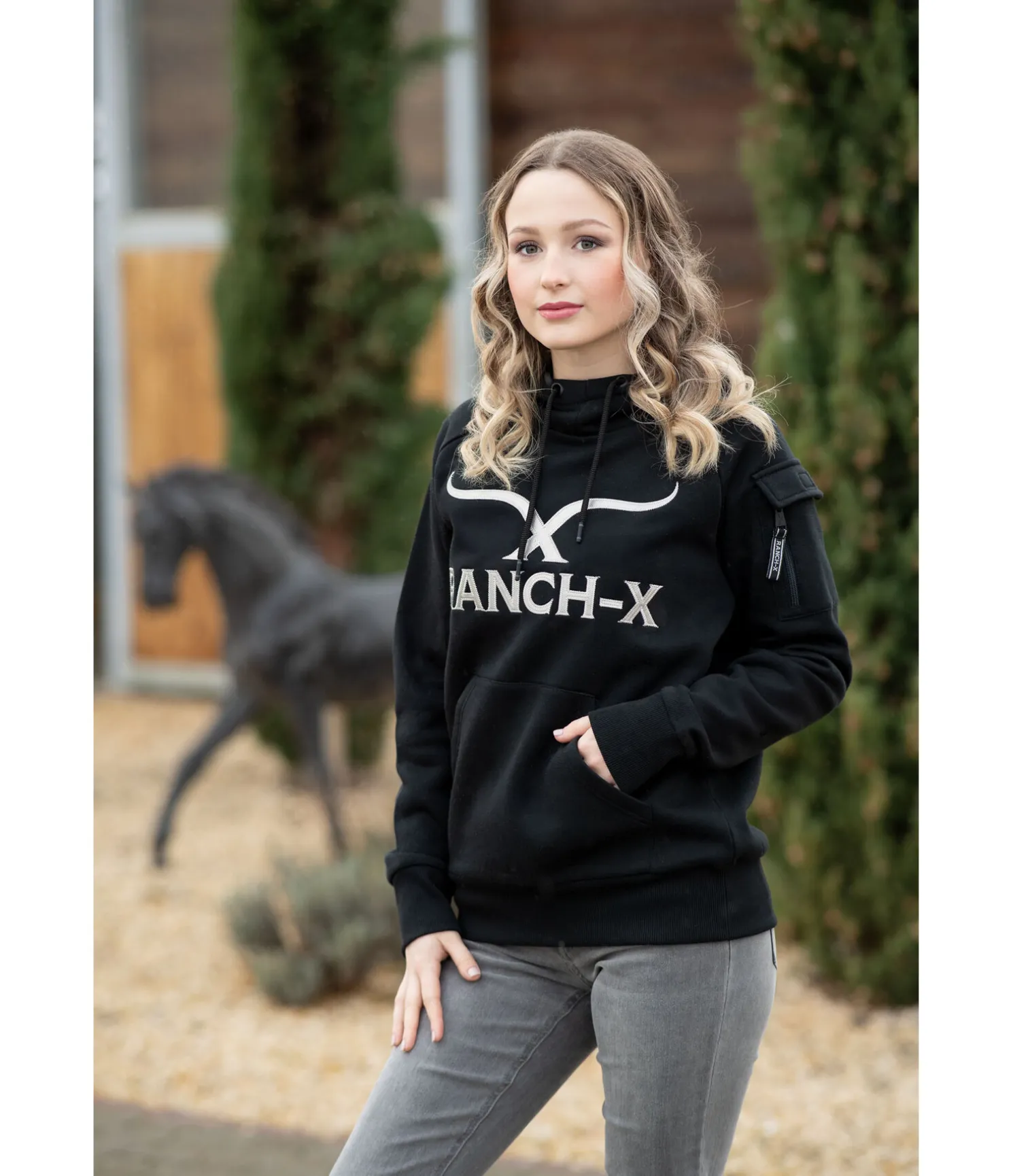 Sweat à capuche sportswear. Matière respirante. Logo RANCH-X en cuir sur la poitrine. Capuche ajustable par cordon de serrage. Poche kangourou. Poche zippée pratique sur la manche. Finition en bord-côte sur le bas des manches. 65 % coton, 35 % polyester.