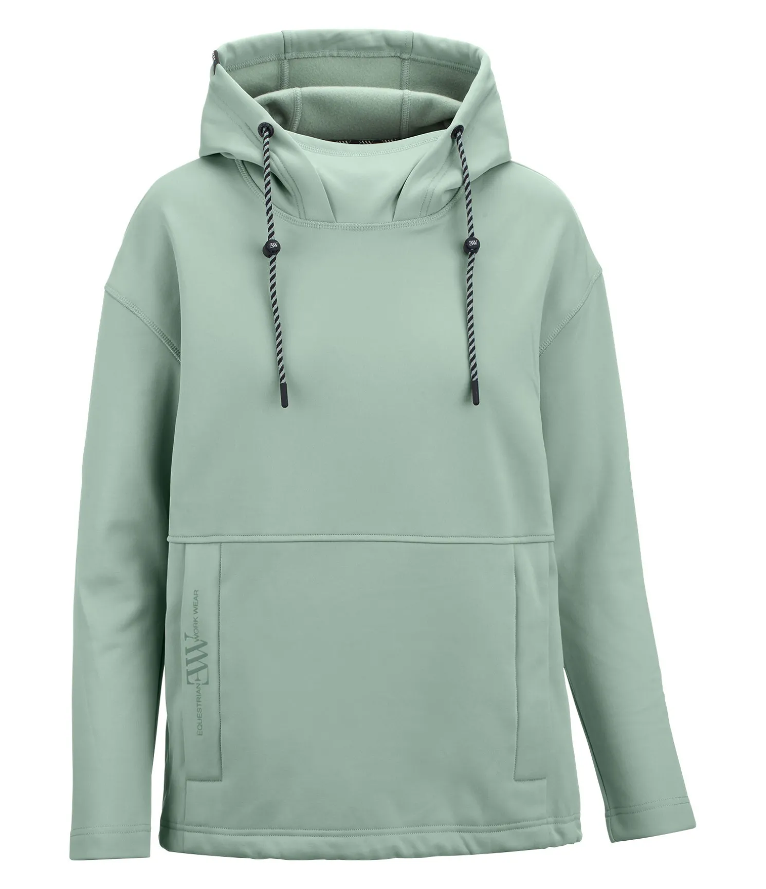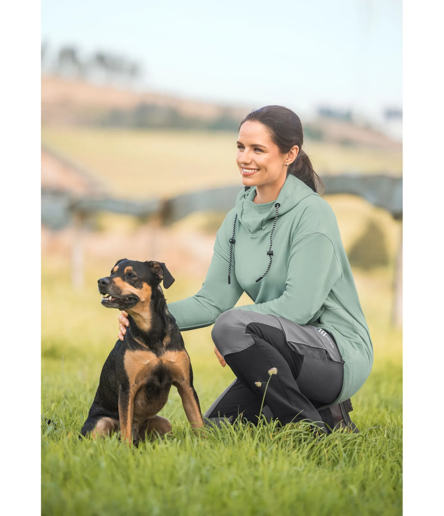 Sweat à capuche décontracté en coupe oversize tendance avec grand imprimé dans le dos. La matière technique lisse à l’extérieur et molletonnée à l’intérieur est respirante, à séchage rapide et anti-saletés. Idéal pour les travaux à l’écurie ! 2 larges poches zippées, un col protégeant du vent, une taille réglable et une capuche complètent cet article indispensable pour toute amatrice de plein air !