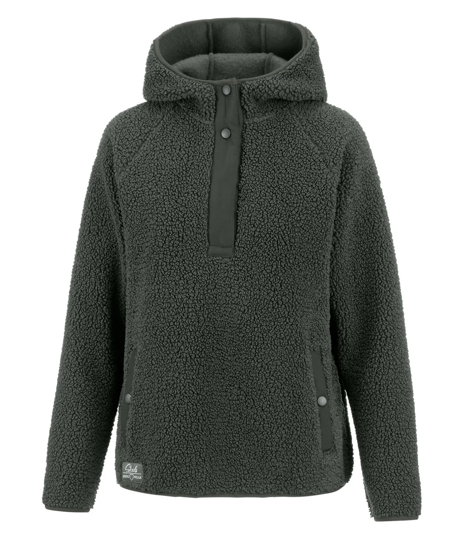 Sweat à capuche en tricot polaire Teddy douce. Patte de boutonnage avec boutons-pression de couleur contrastante. Deux poches latérales avec bouton-pression. Bord élastiqué de couleur contrastante sur le bas des manches, la capuche et l’ourlet. Étiquette STEEDS à l’ourlet. 100 % polyester.