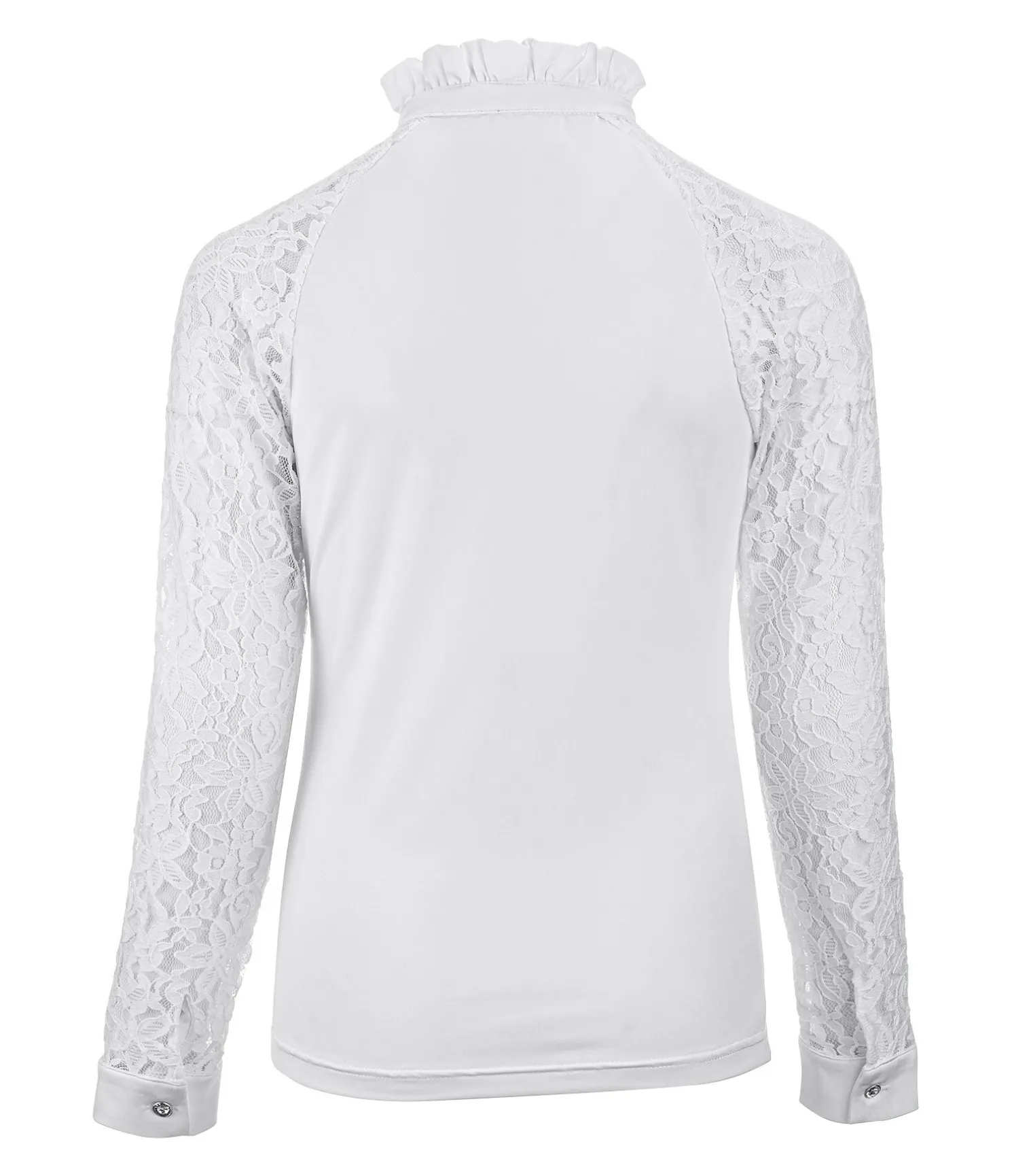Élégant T-shirt de concours à manches longues en dentelle douce avec col à volants et boutons à strass. Respirant et à séchage rapide. 88 % polyester, 12 % élasthanne. Remarque : lavage à la main ou dans un sac de lavage recommandé.