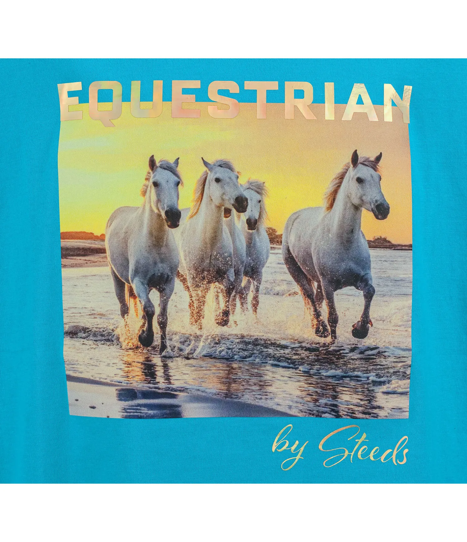 T-shirt décontracté à col rond. Grand imprimé à l’avant avec slogan « EQUESTRIAN » métallisé. Coupe légèrement plus longue à l’arrière. 100 % coton.