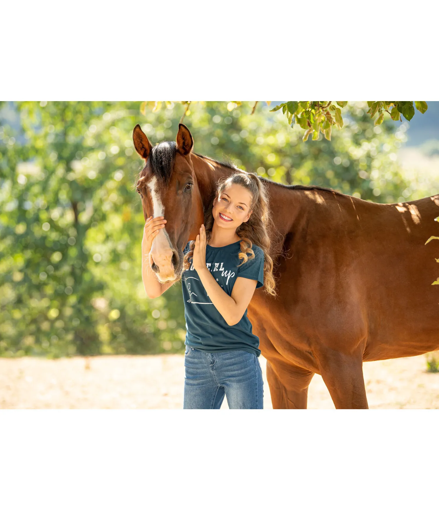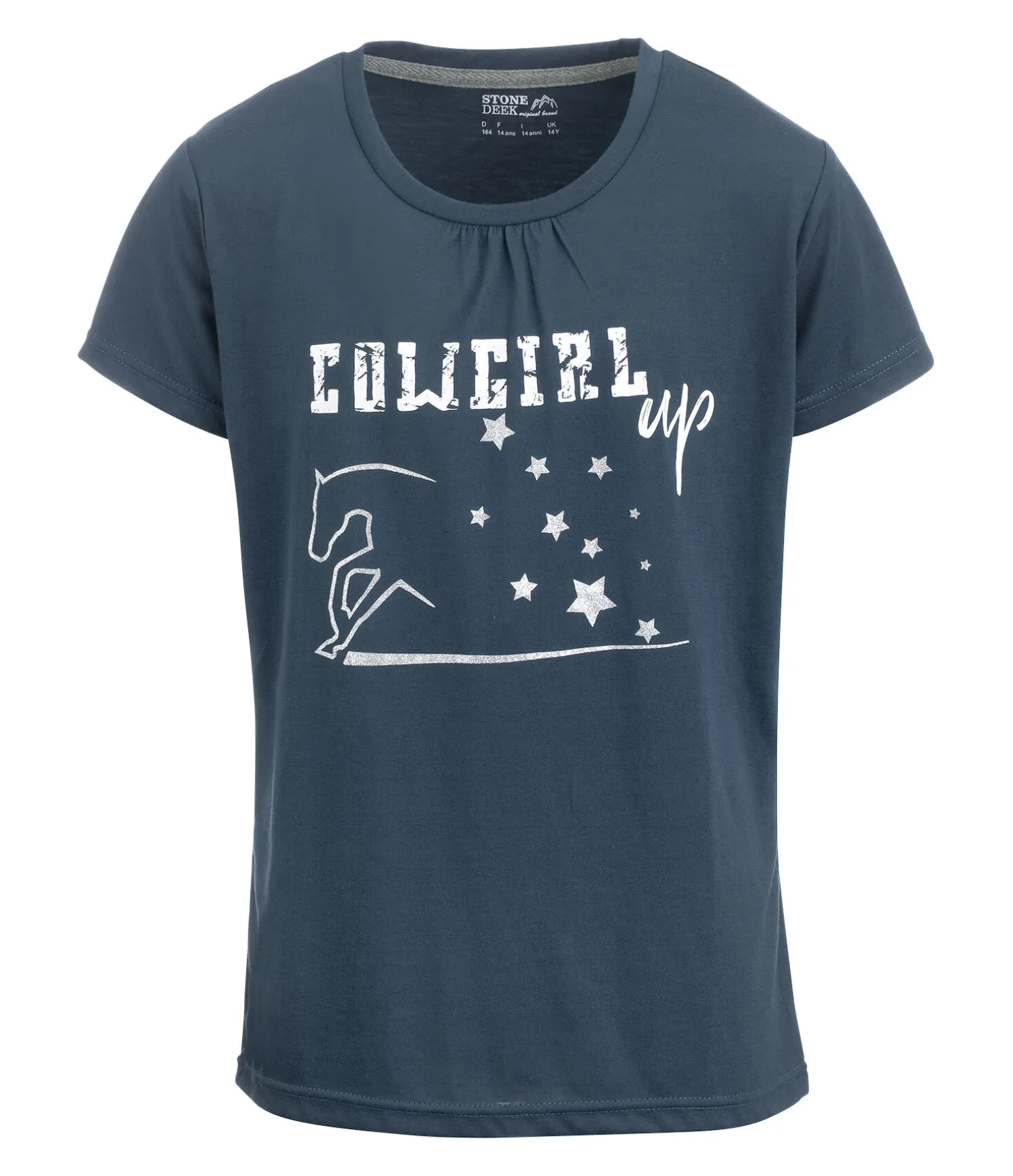 T-shirt pour vraies cow-girls avec plissé au col et superbe motif pailleté sur la poitrine. 65 % polyester, 35 % coton.